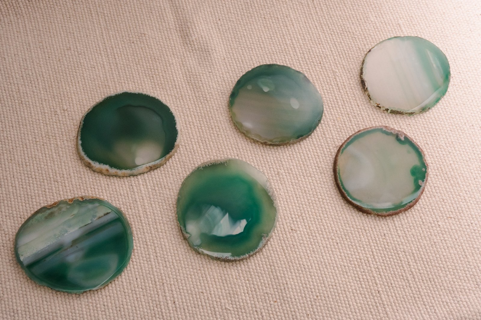 O Conjunto com 6 Porta-Copos Rústico em Pedra Ágata Verde transforma o simples ato de servir em um gesto de elegância e conexão com a natureza. Cada conjunto reflete a beleza bruta da Terra lapidada com delicadeza. As pedras de ágata verde revelam desenhos internos que lembram anéis de crescimento, formados ao longo de milhares de anos. Ao serem polidas, ganham brilho vítreo e deixam transparecer camadas translúcidas que capturam a luz de maneira única.