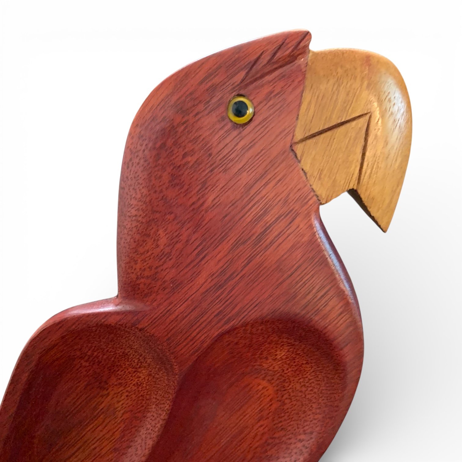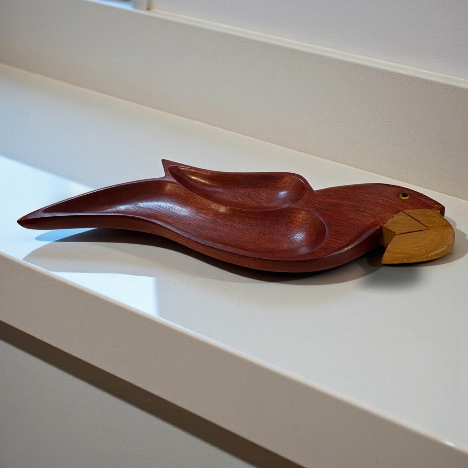 Esculpida e finalizada à mão em madeira, a bandeja petisqueira arara apresenta formato em silhueta que define o design da peça. A forma orienta a disposição dos petiscos de maneira prática e organizada, sem excessos. O trabalho valoriza linhas bem definidas e proporções equilibradas. O resultado é uma bandeja funcional, com presença visual marcante e desenho singular.