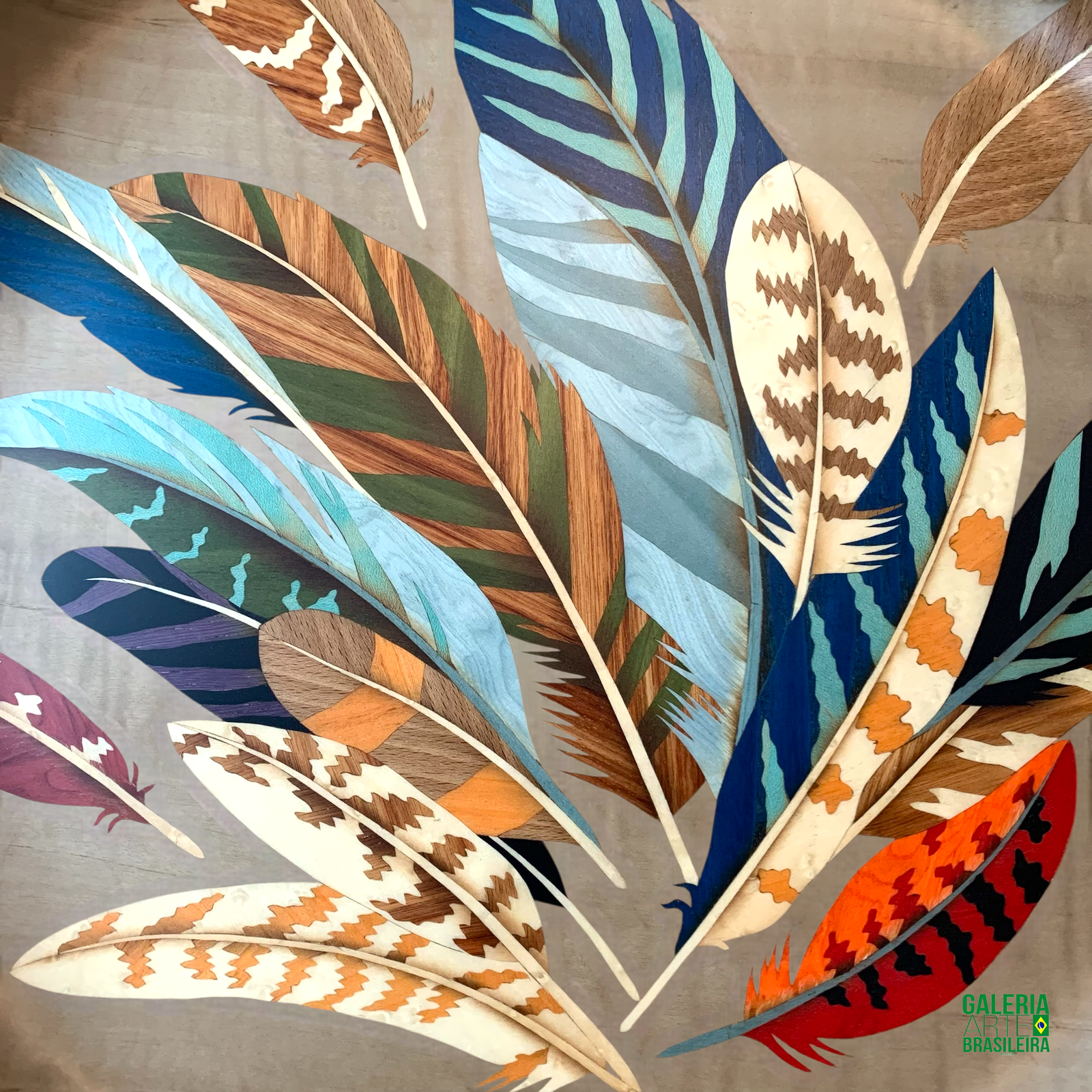 Esta bandeja em madeira marchetada destaca-se pelo trabalho artesanal minucioso, que une beleza natural e design sofisticado. Os detalhes em formato de penas trazem movimento e leveza à peça, transformando-a em um objeto decorativo exclusivo e funcional.