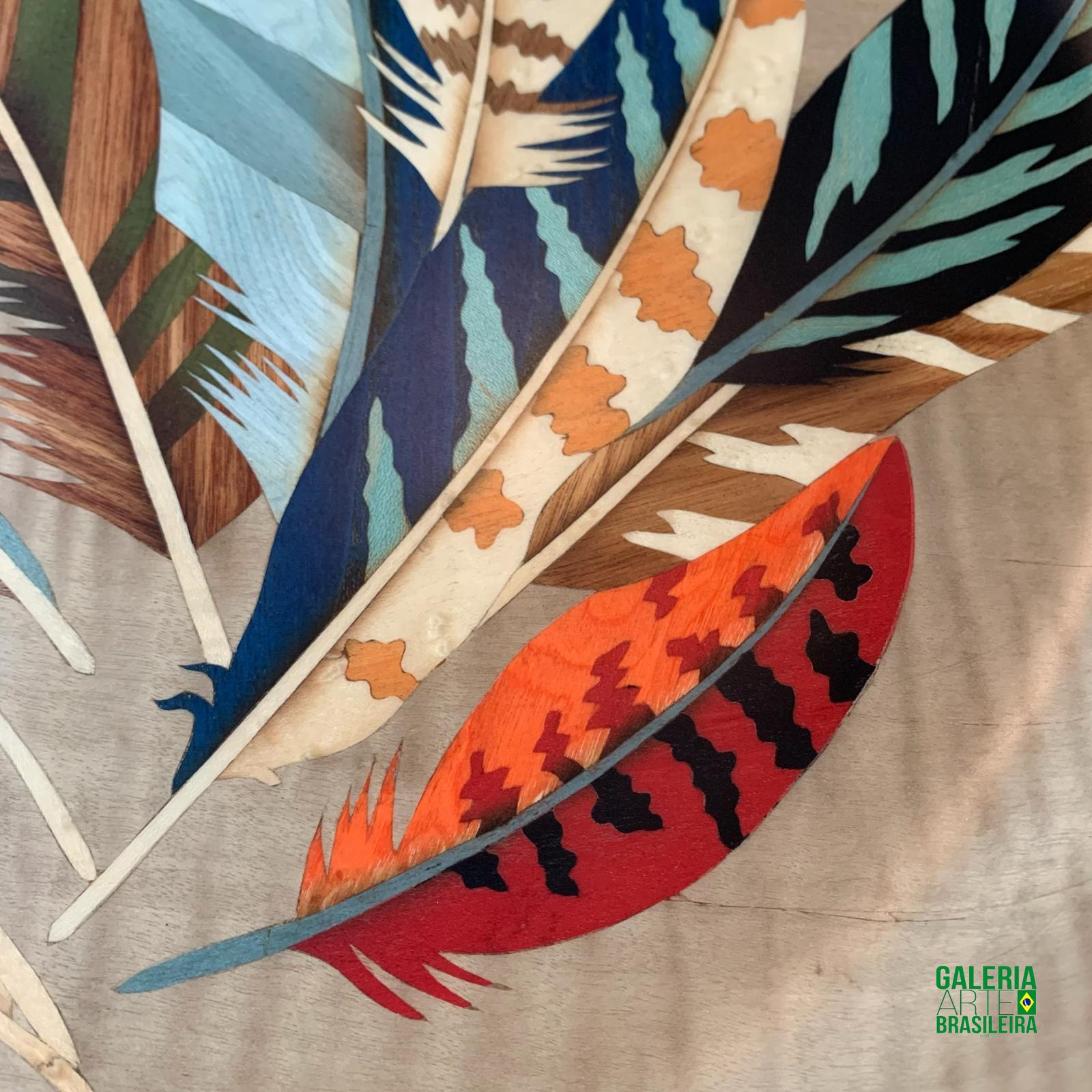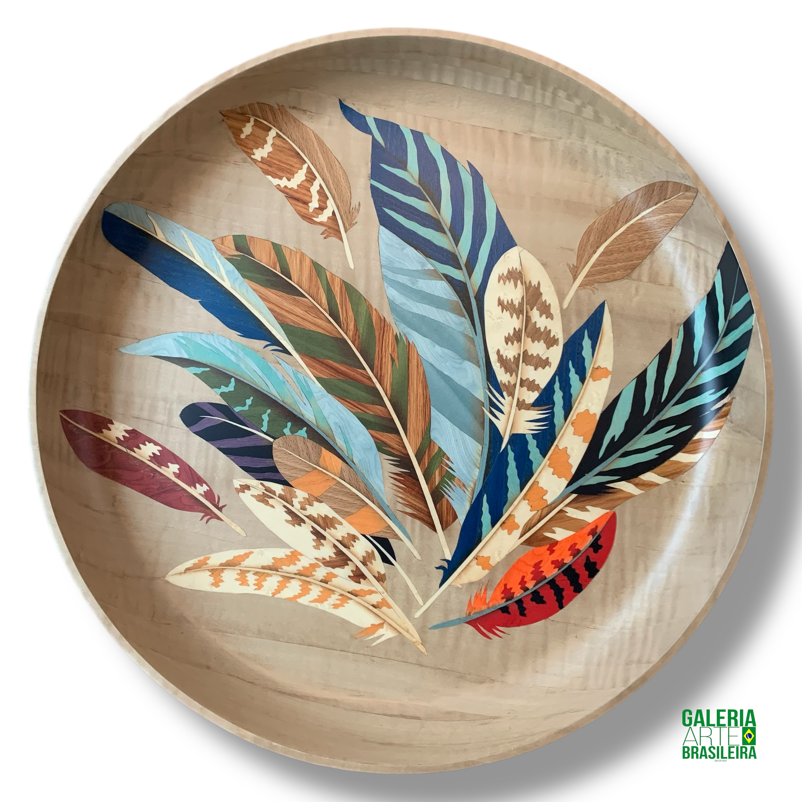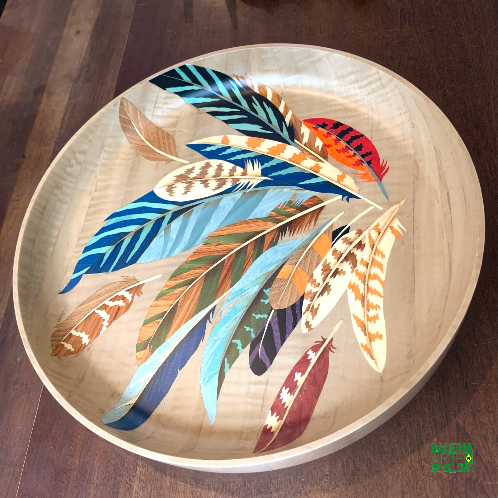 Bandeja em Madeira Marchetada com Detalhes em Penas