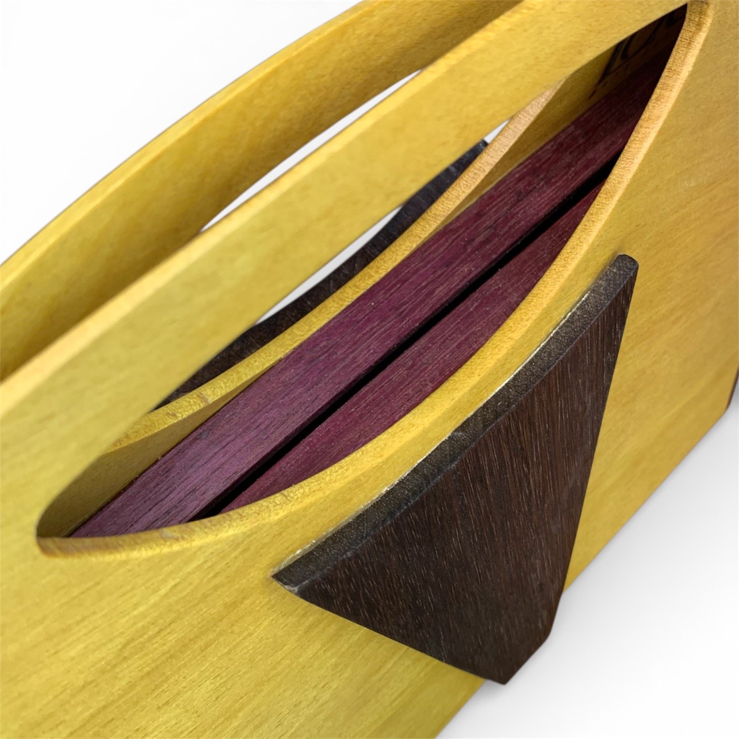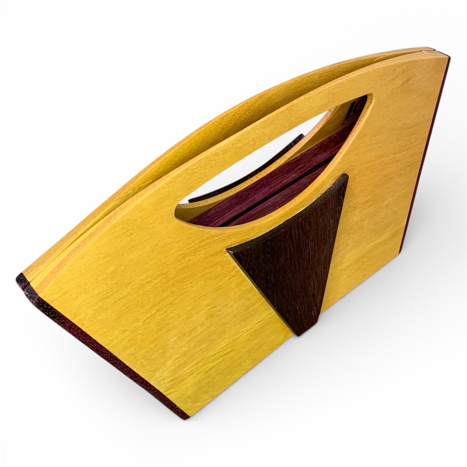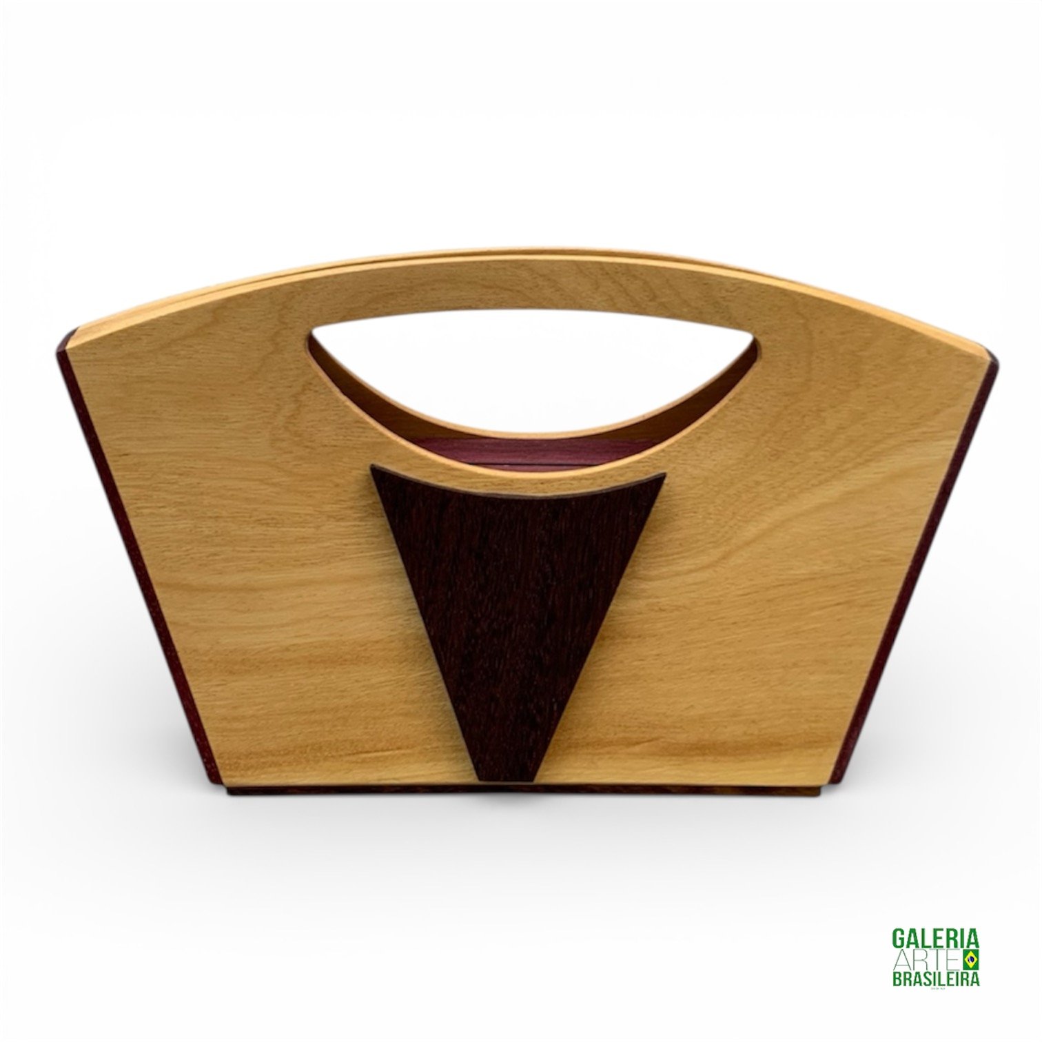 Bolsa de mão com madeira roxinho, pensado para o uso cotidiano. A peça apresenta linhas firmes e bem definidas, que valorizam a estrutura da madeira e garantem presença marcante ao objeto. Nas laterais, o detalhe em madeira roxinho chama atenção de forma sutil e precisa. Seu tom arroxeado profundo cria contraste natural e revela a nobreza dessa espécie brasileira, conhecida pela resistência, pela densidade e pela coloração única que se intensifica com o tempo.