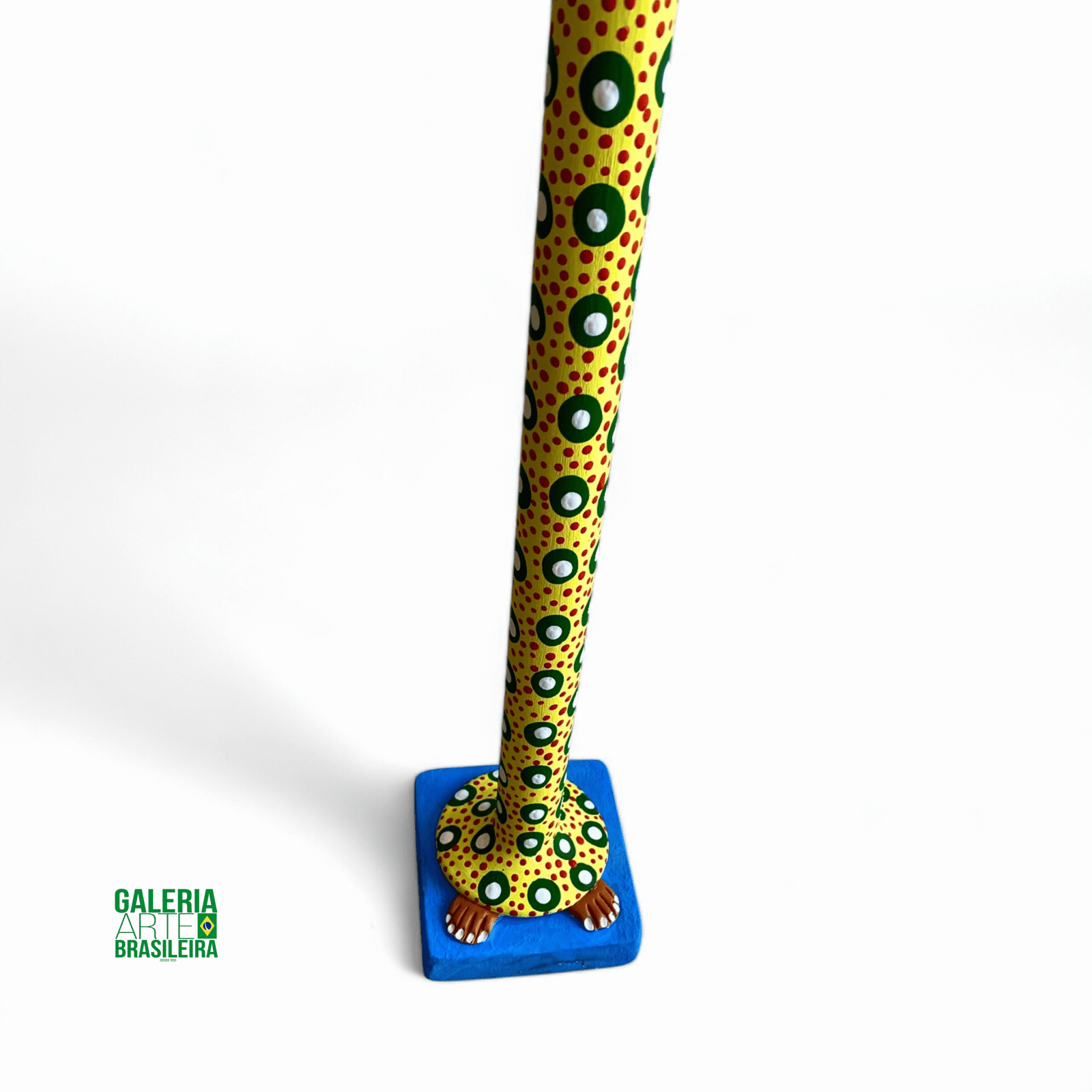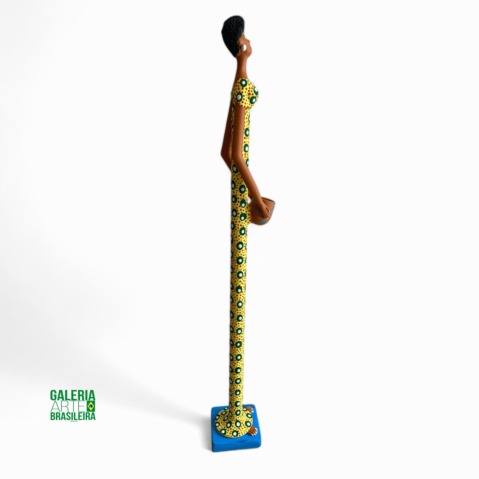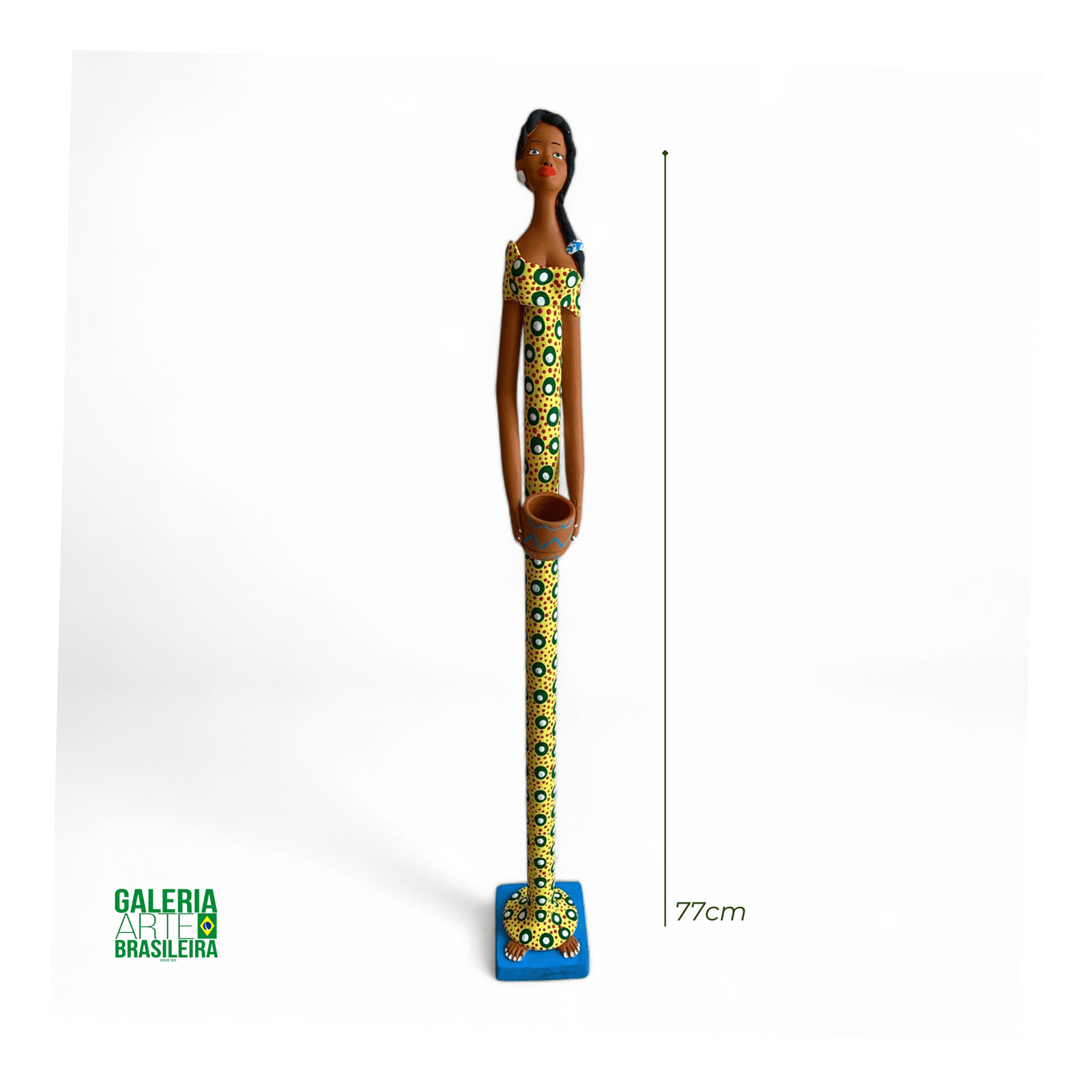 Esculpida por um grande mestre brasileiro, esta obra em madeira revela a força e a beleza da arte popular. A boneca, em posição elegante, segura um vaso e exibe com orgulho traços marcantes da mulher brasileira, como a maquiagem delicada e as unhas pintadas. O resultado é uma peça cheia de personalidade e expressão, que une tradição, cor e identidade cultural em um só olhar.