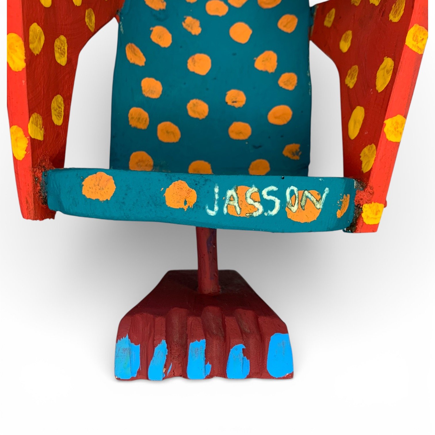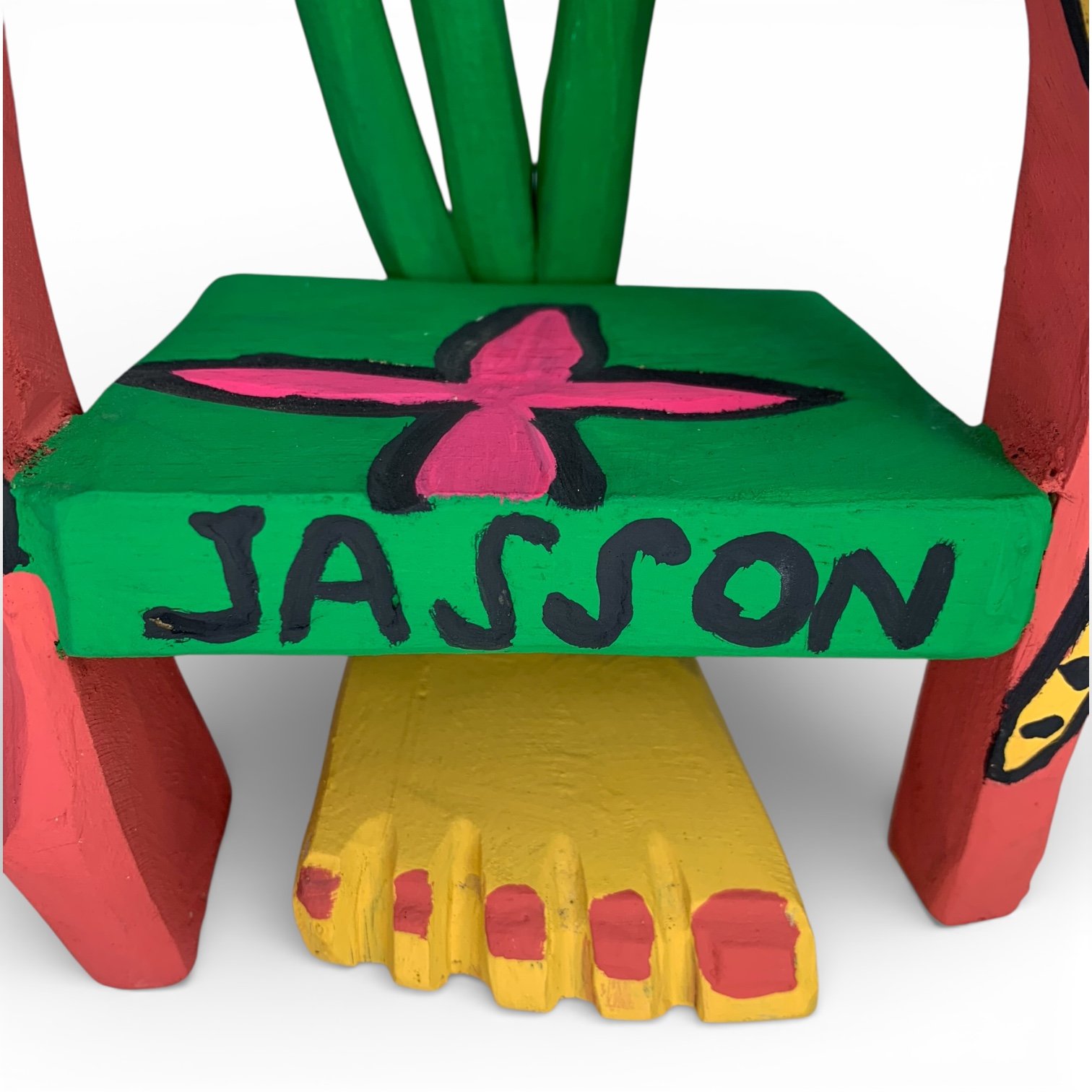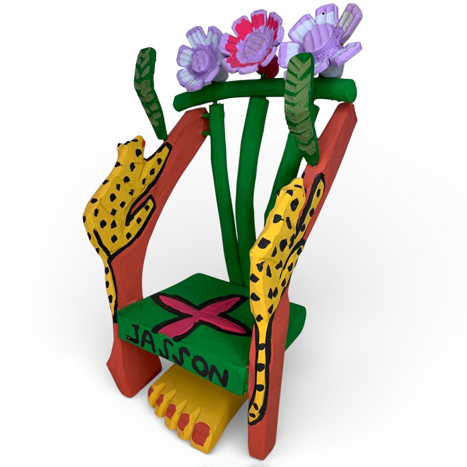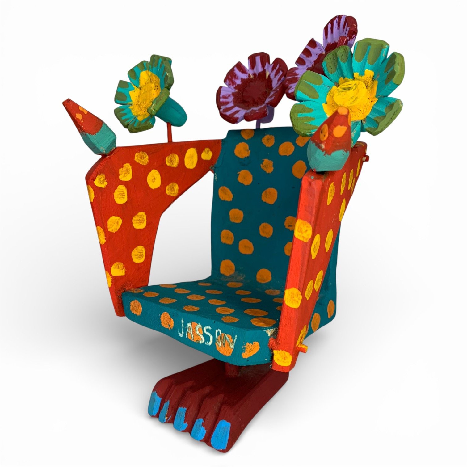 A cadeira decorativa em madeira transformam um objeto simples em peça artística, marcada por cores vivas, composição equilibrada e forte presença visual. Esculpidas e pintadas à mão, acabamento cuidadoso e uso expressivo da cor, que traz leveza e alegria à peça sem perder o caráter decorativo.