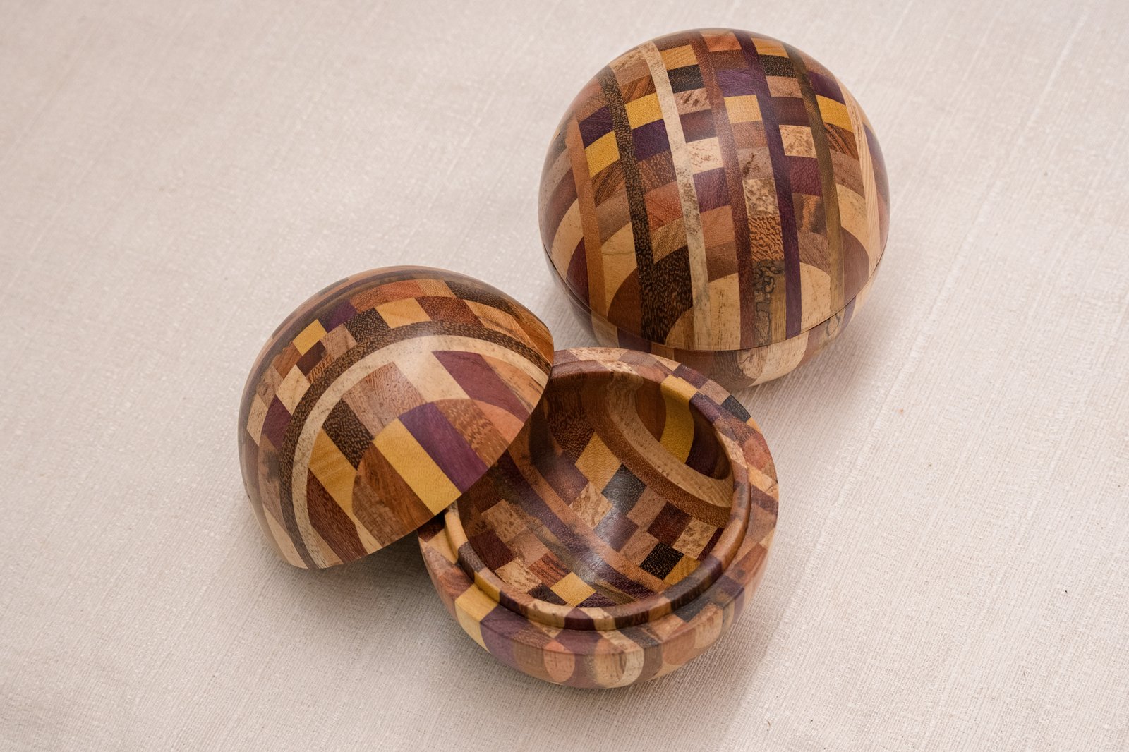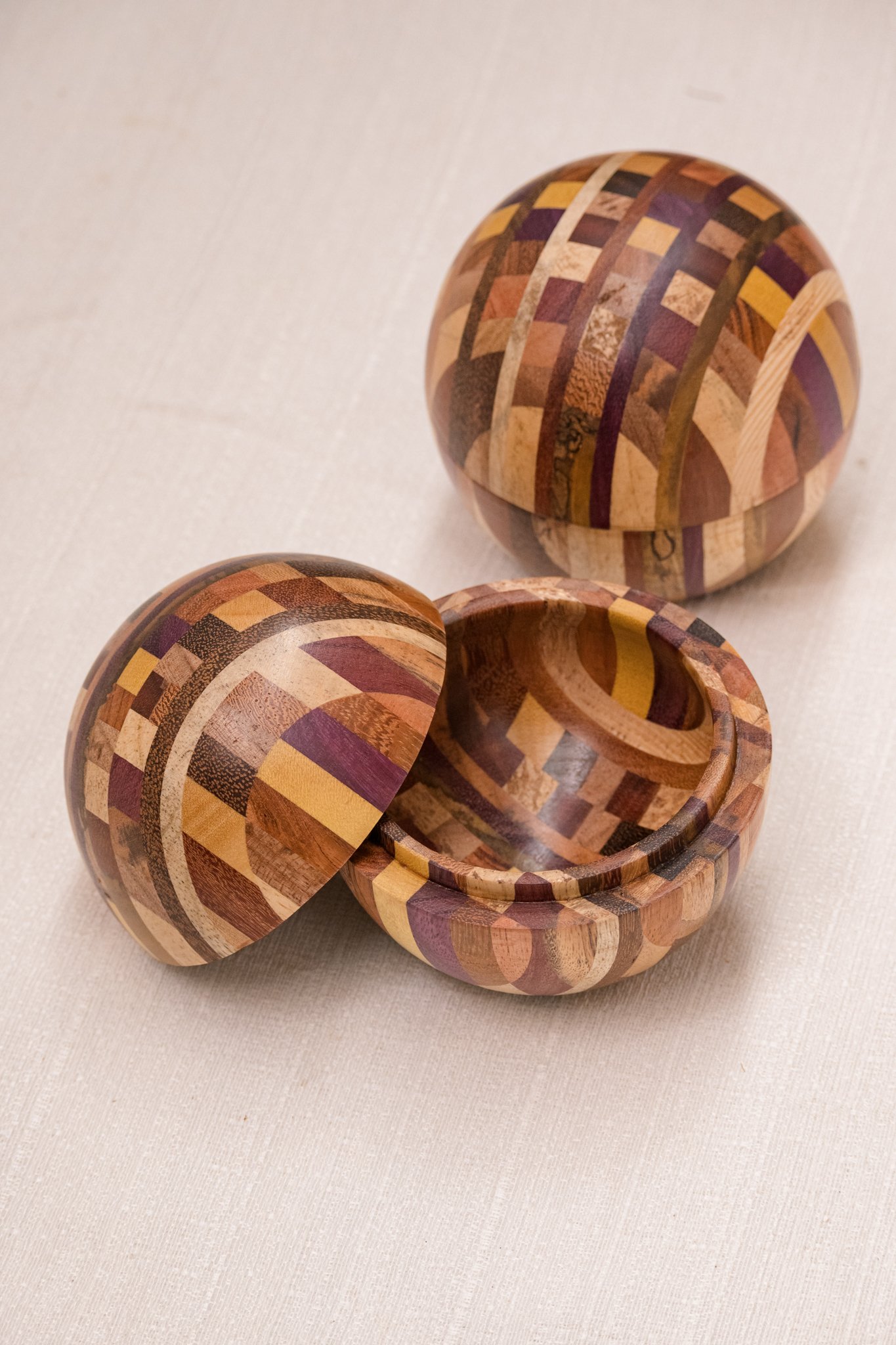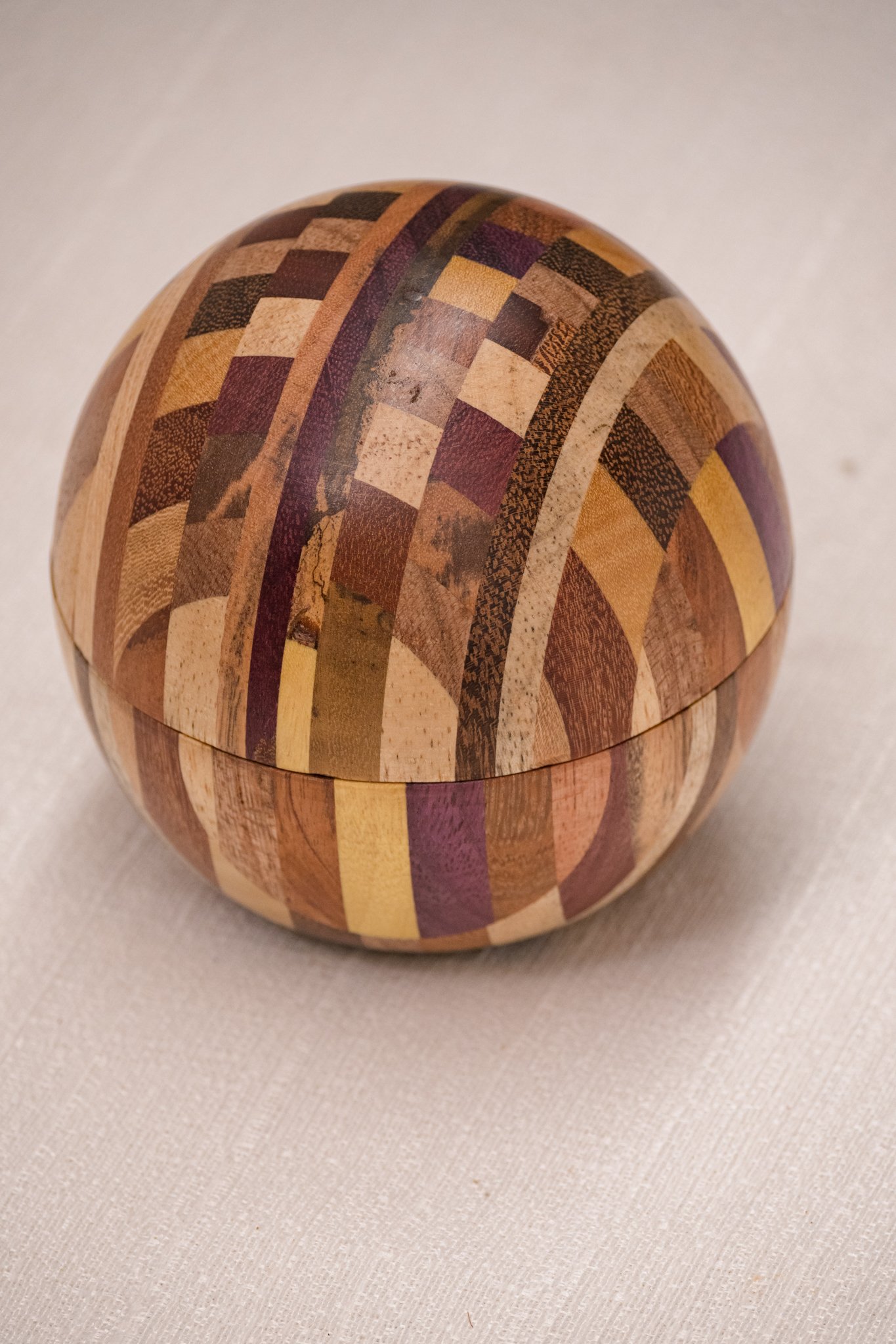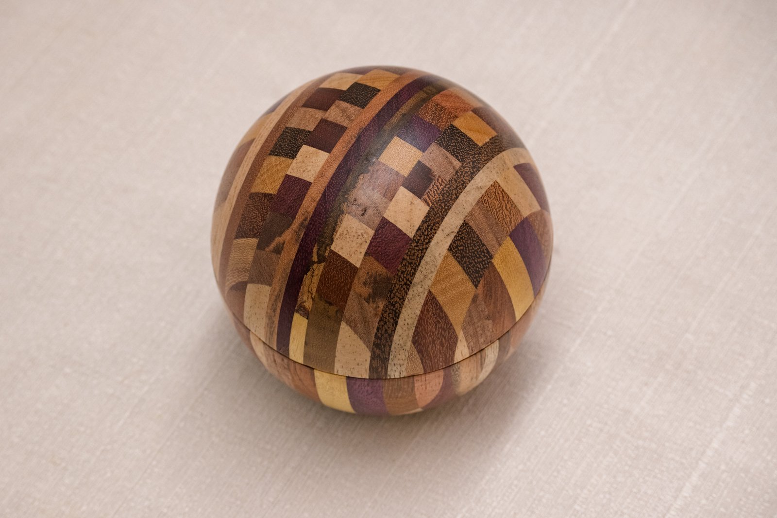 A Caixa Bola em Marchetaria feita de pequenos segmentos de diferentes madeiras brasileiras, formando um mosaico curvo que exige cálculo, habilidade manual e controle minucioso de cada corte. O formato esférico só se torna possível quando todas as peças se encaixam com exatidão, resultando em uma superfície contínua e suave ao toque.
