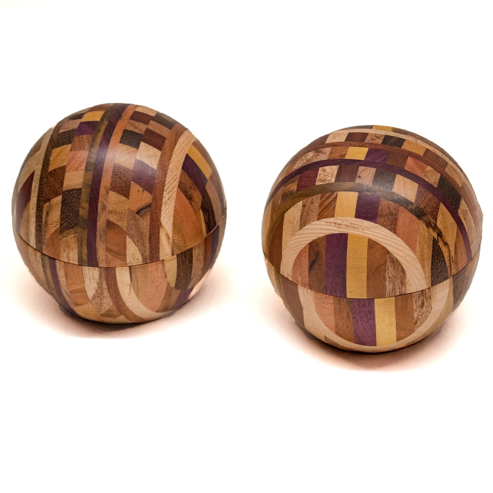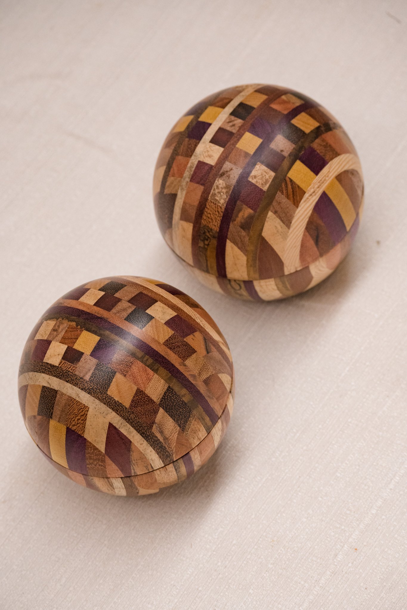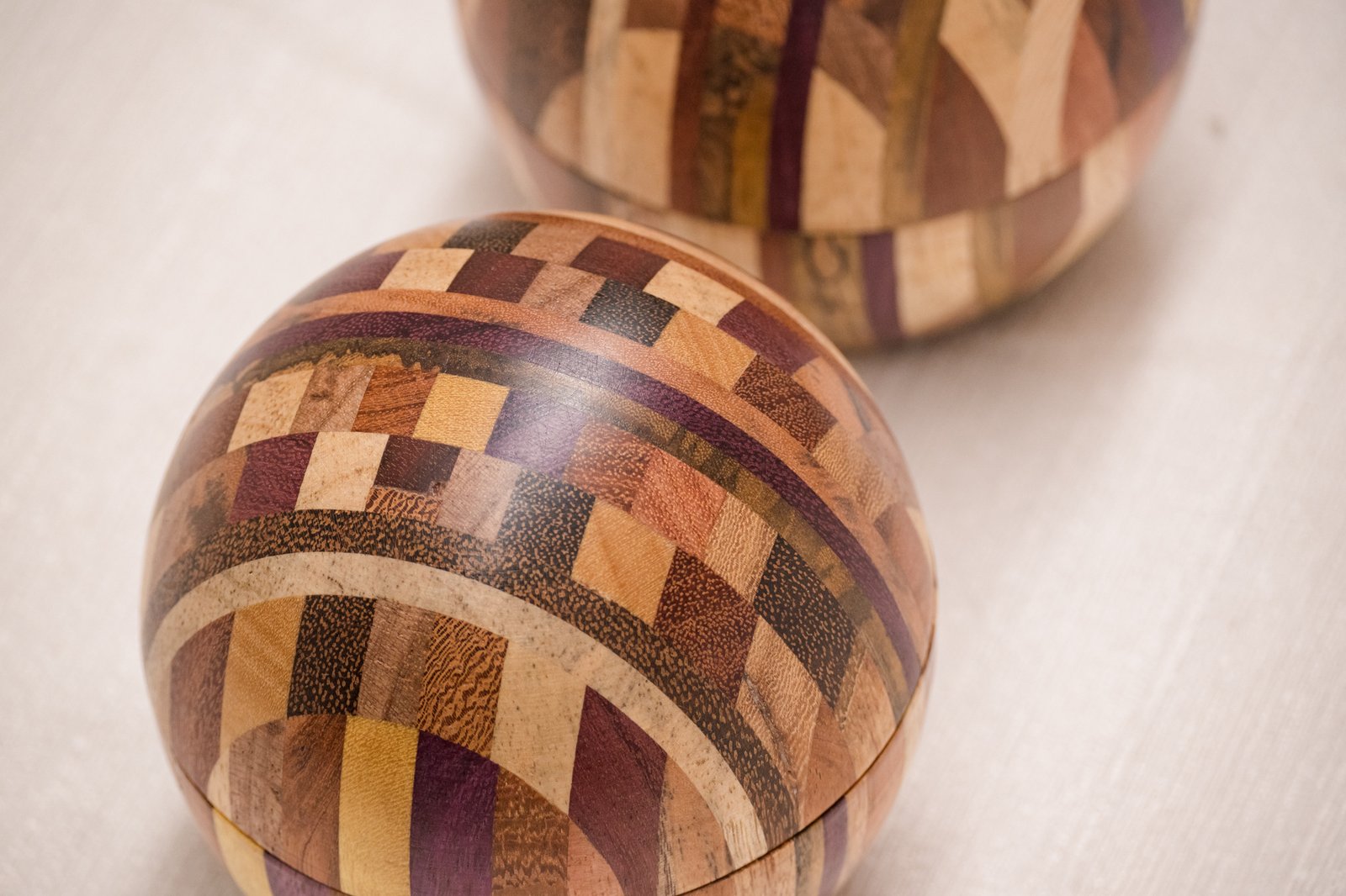 A Caixa Bola em Marchetaria feita de pequenos segmentos de diferentes madeiras brasileiras, formando um mosaico curvo que exige cálculo, habilidade manual e controle minucioso de cada corte. O formato esférico só se torna possível quando todas as peças se encaixam com exatidão, resultando em uma superfície contínua e suave ao toque.