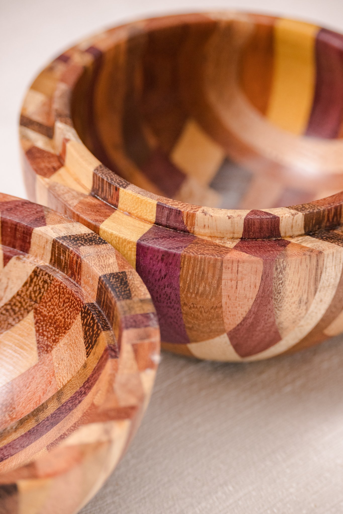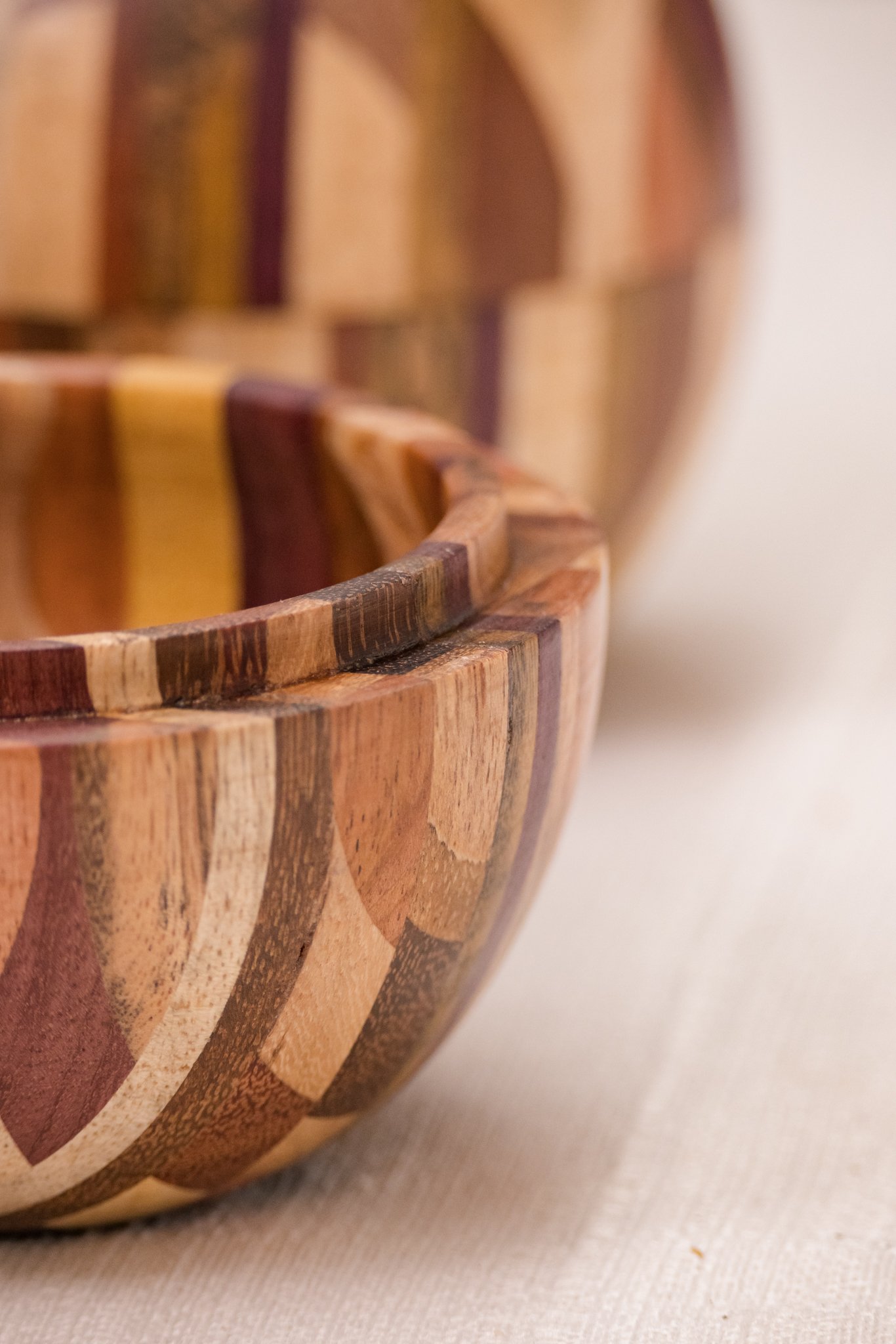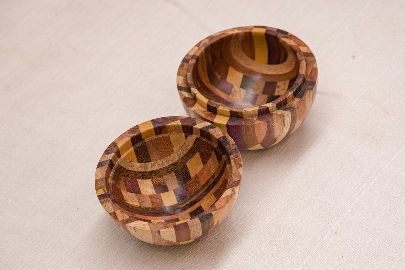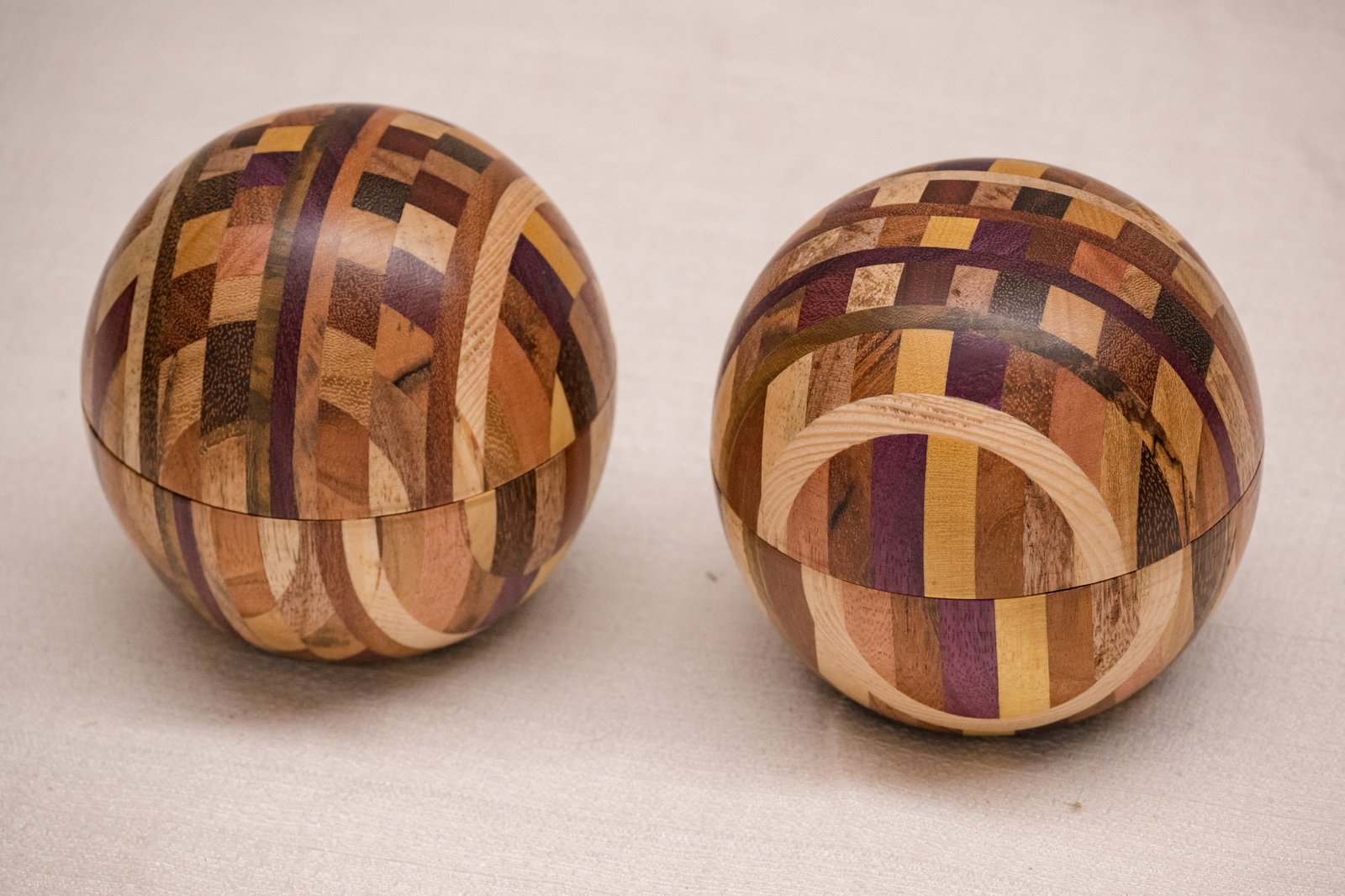 A Caixa Bola em Marchetaria feita de pequenos segmentos de diferentes madeiras brasileiras, formando um mosaico curvo que exige cálculo, habilidade manual e controle minucioso de cada corte. O formato esférico só se torna possível quando todas as peças se encaixam com exatidão, resultando em uma superfície contínua e suave ao toque.