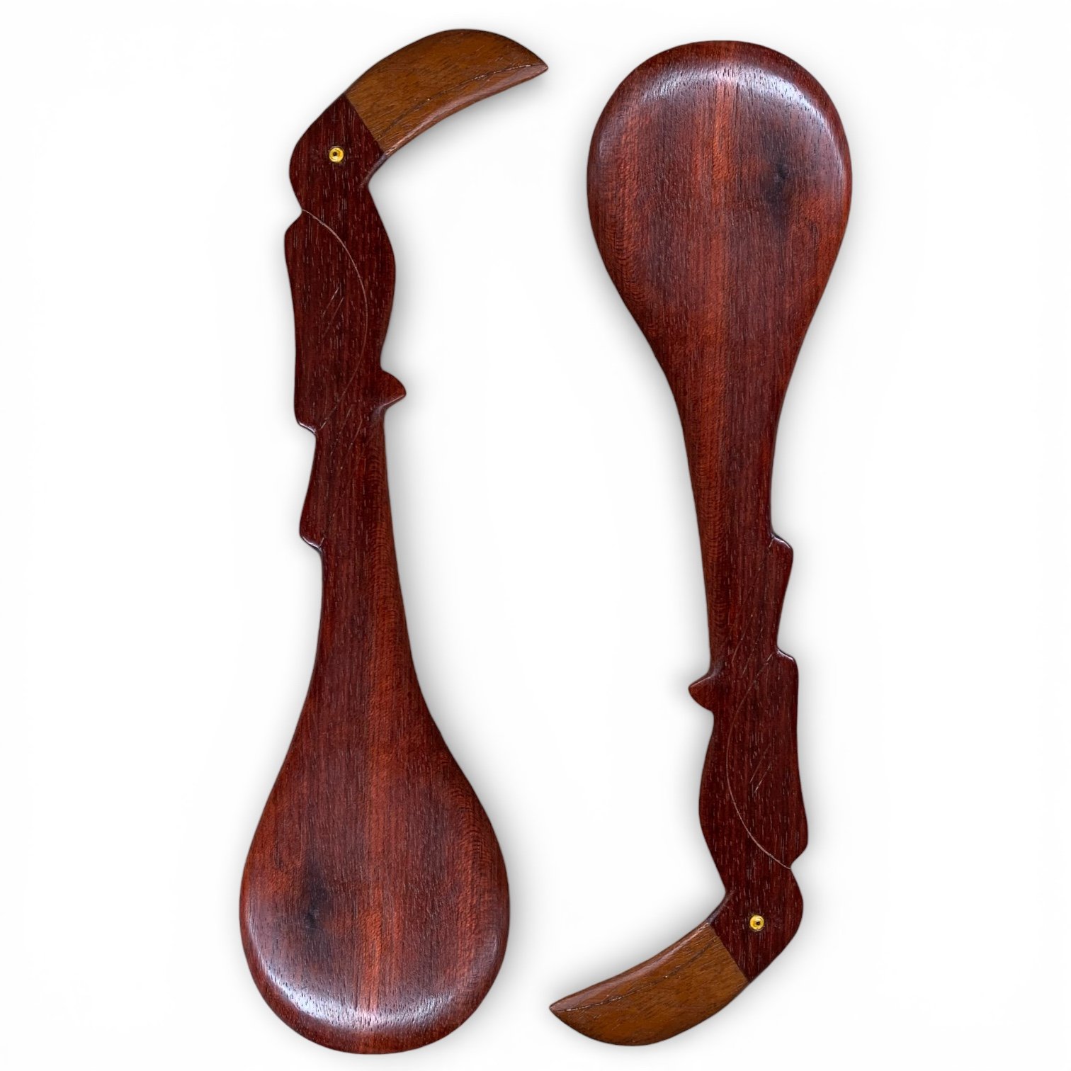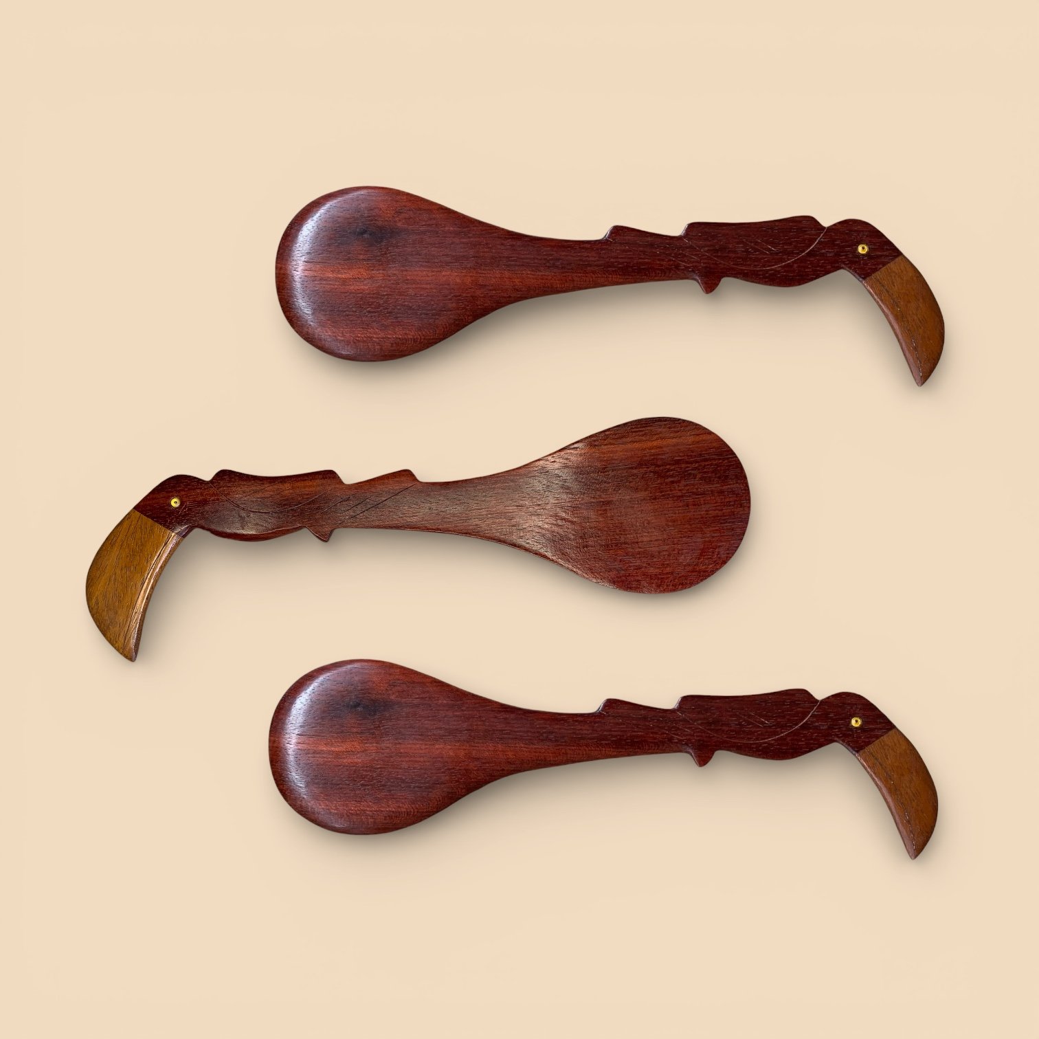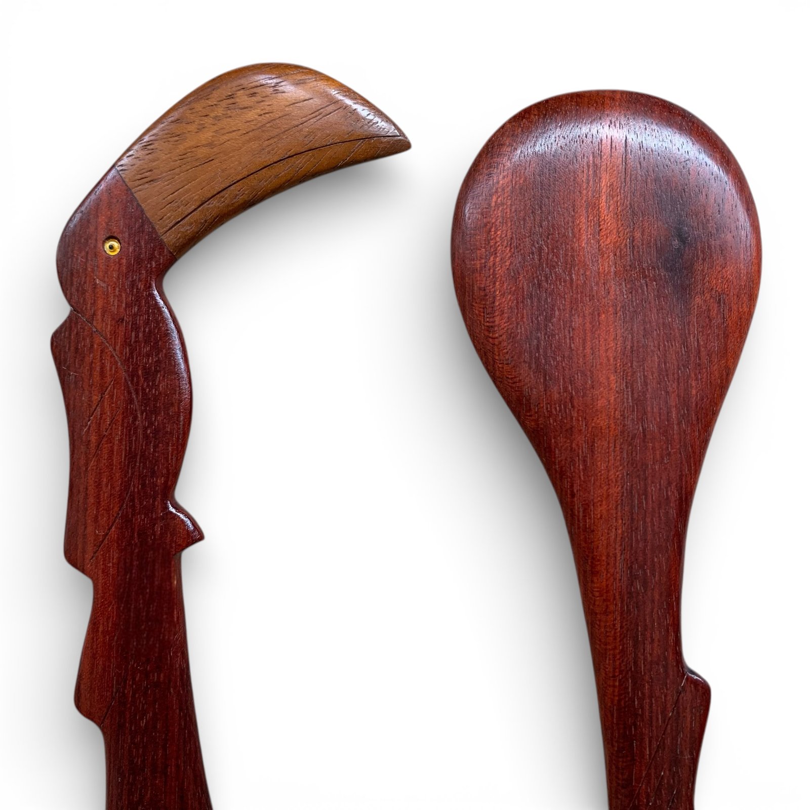 A colher de pau é feita em madeira e apresenta cabo alongado, que recebe a escultura de um tucano no topo. O pássaro se destaca pelo bico curvo e volumoso, com contraste de tonalidade entre a madeira do corpo e a madeira mais clara utilizada no bico, além do pequeno detalhe circular que marca o olho. O desenho mantém linhas limpas e bem definidas, resultado de um trabalho de escultura manual preciso.