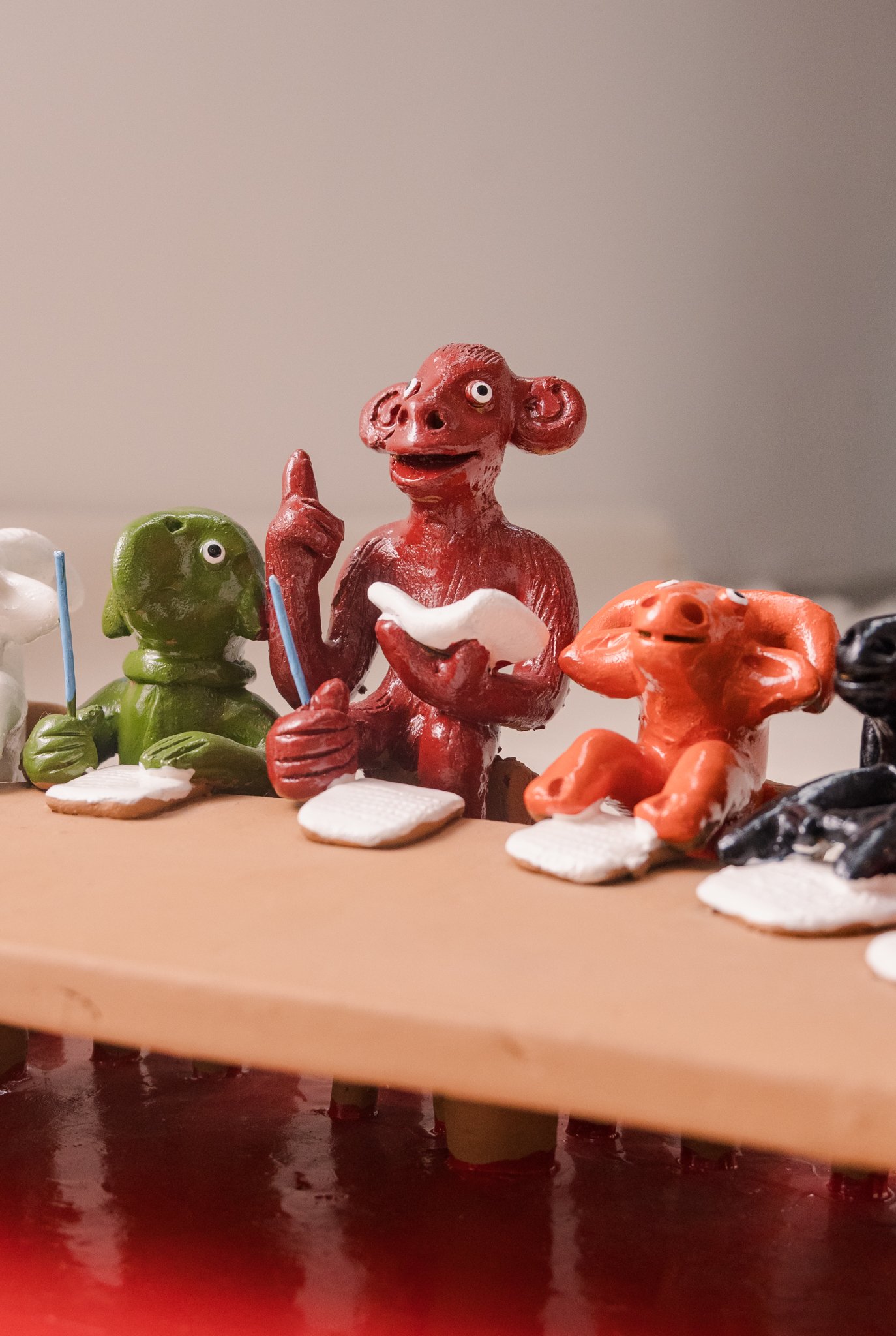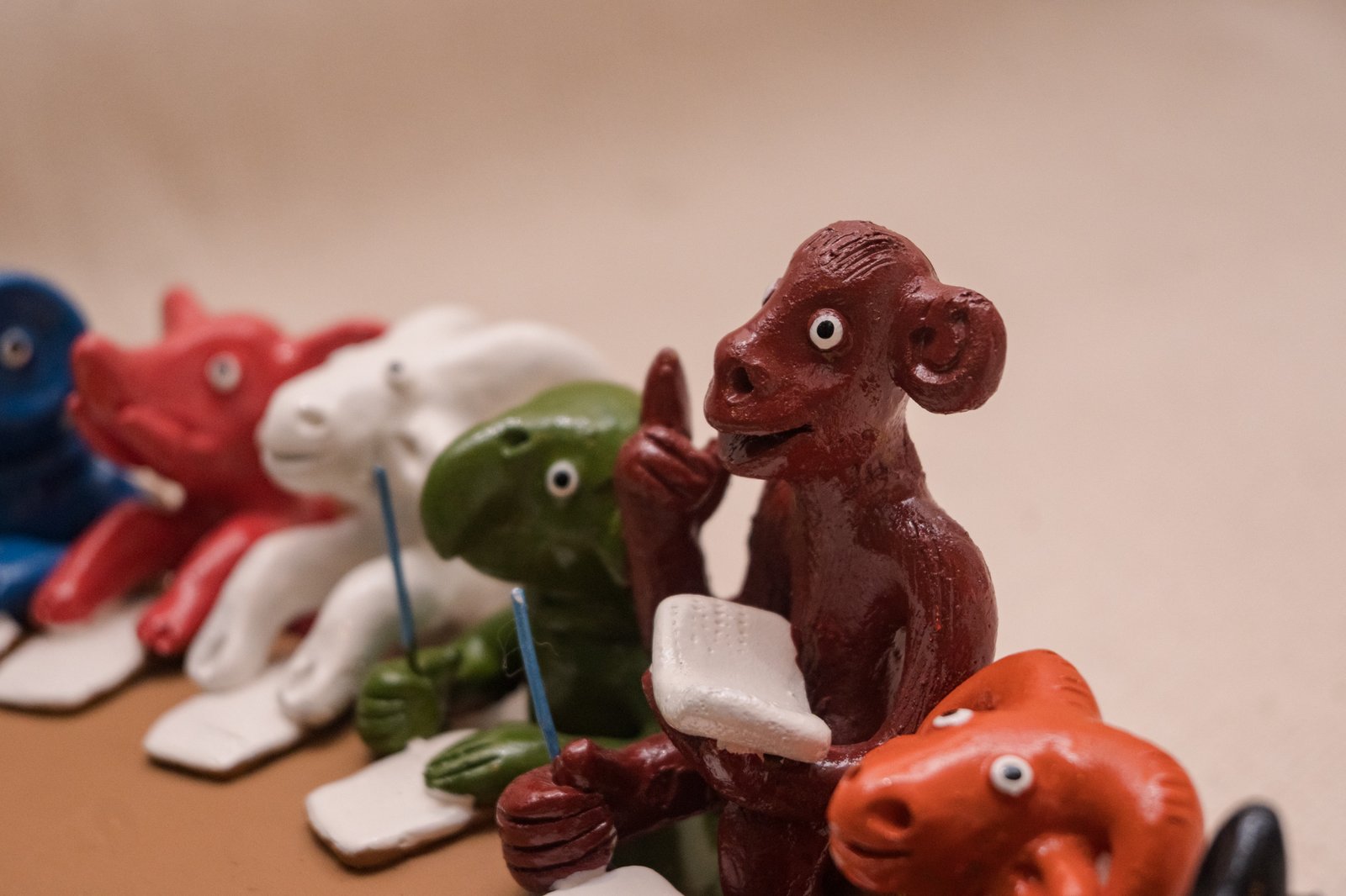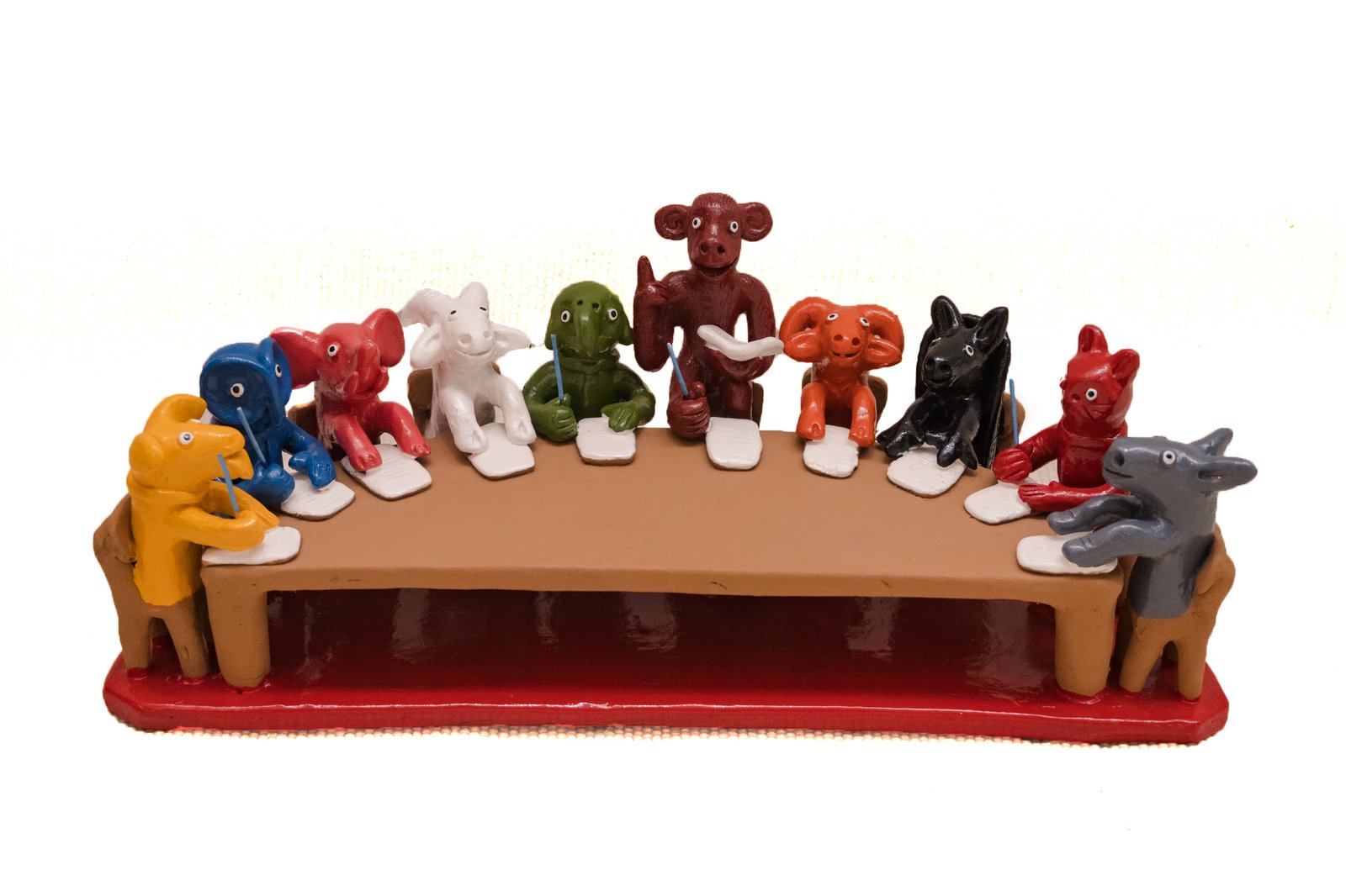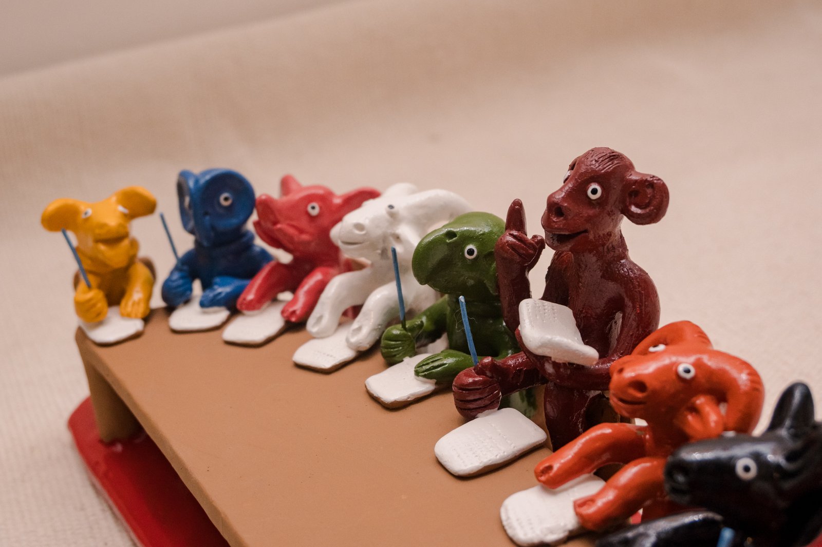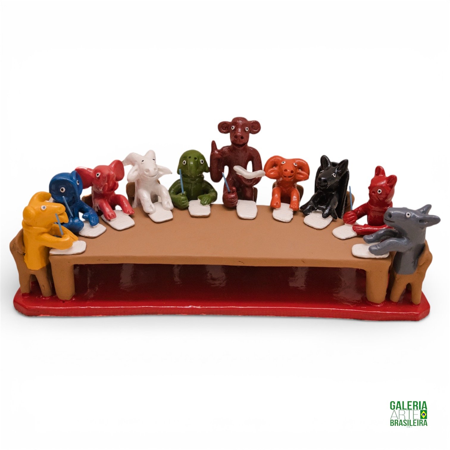 A Escultura Escola dos Bichos apresenta uma cena em cerâmica que mostra animais reunidos ao redor de uma mesa de estudos. Cada personagem ocupa seu lugar como aluno, com gestos e expressões que constroem uma narrativa clara e bem-humorada. A composição organiza os elementos de forma equilibrada, permitindo que o olhar percorra a cena com facilidade.