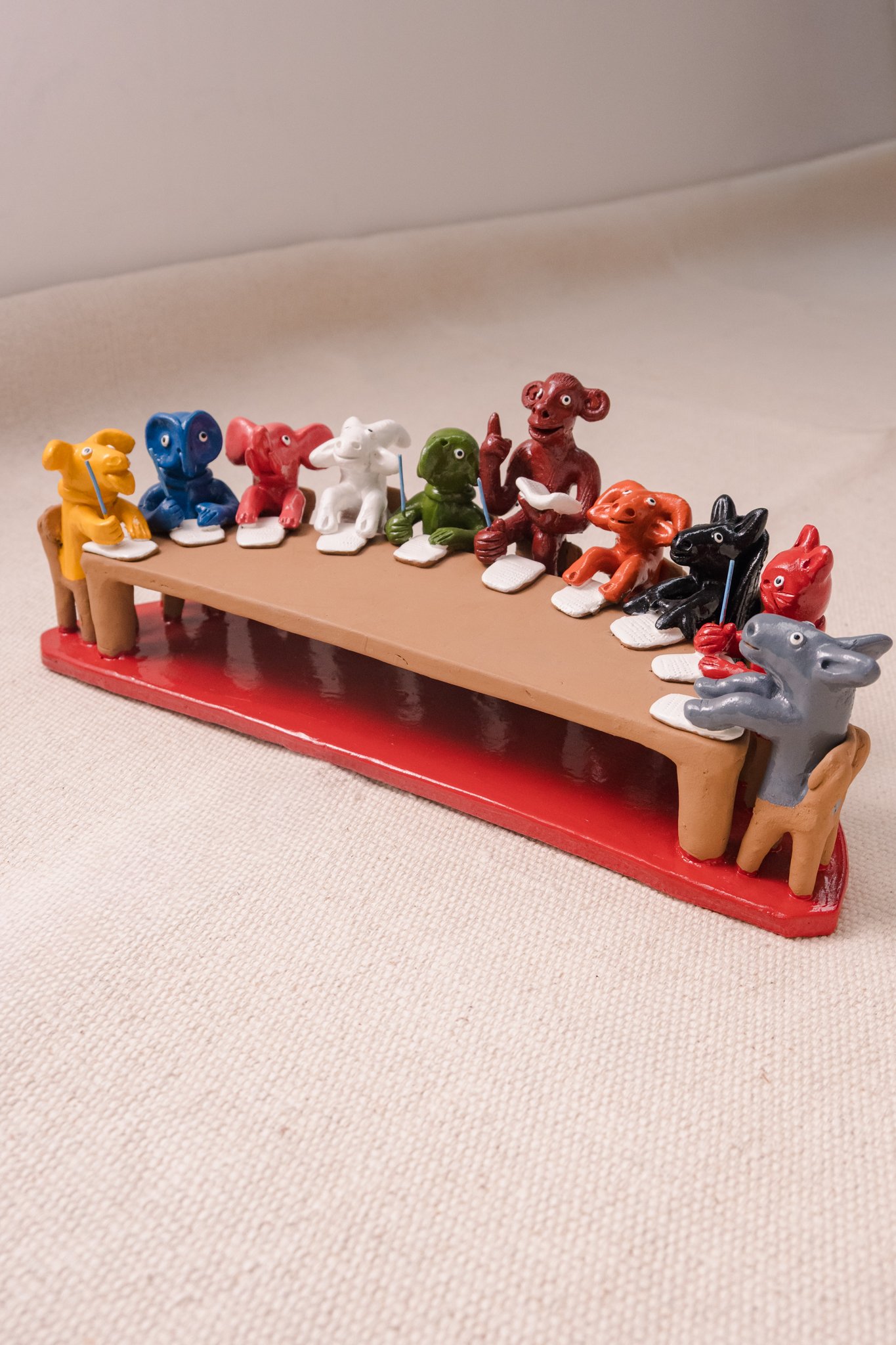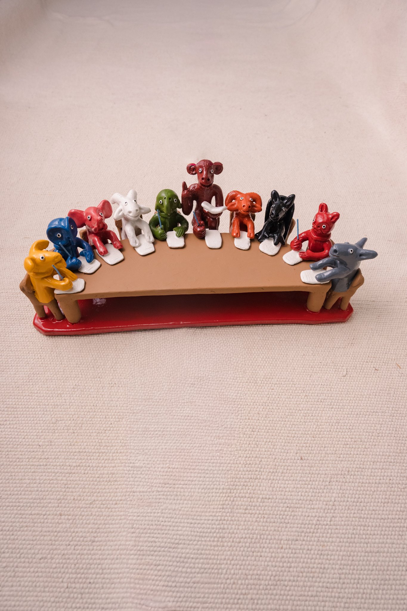 A modelagem manual evidencia o trabalho artesanal em cada detalhe, desde os corpos dos animais até os livros e a mesa. A cerâmica mantém marcas do processo de criação, reforçando o caráter autoral da peça. O conjunto desperta curiosidade e aproxima o observador da cena representada. Escola dos Bichos funciona como objeto decorativo e também como imagem simbólica do aprendizado e da convivência.