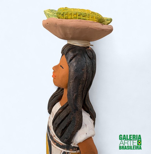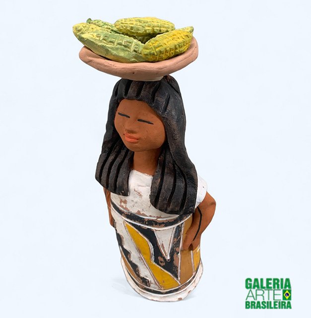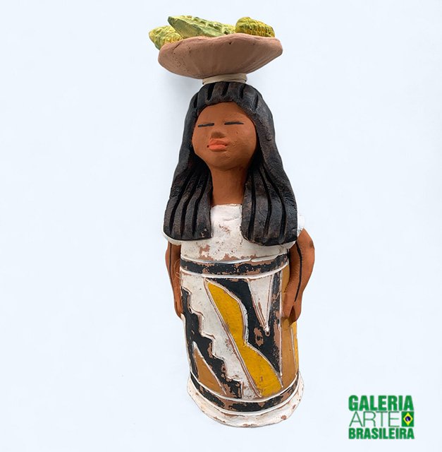 Escultura indígena com cesta de milho, feita e pintado à mão e com um belíssimo acabamento.