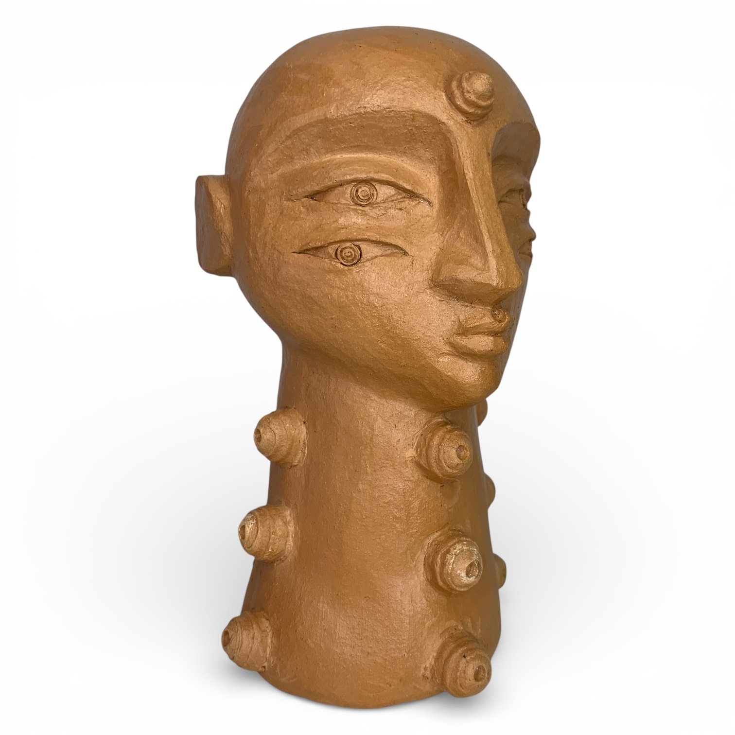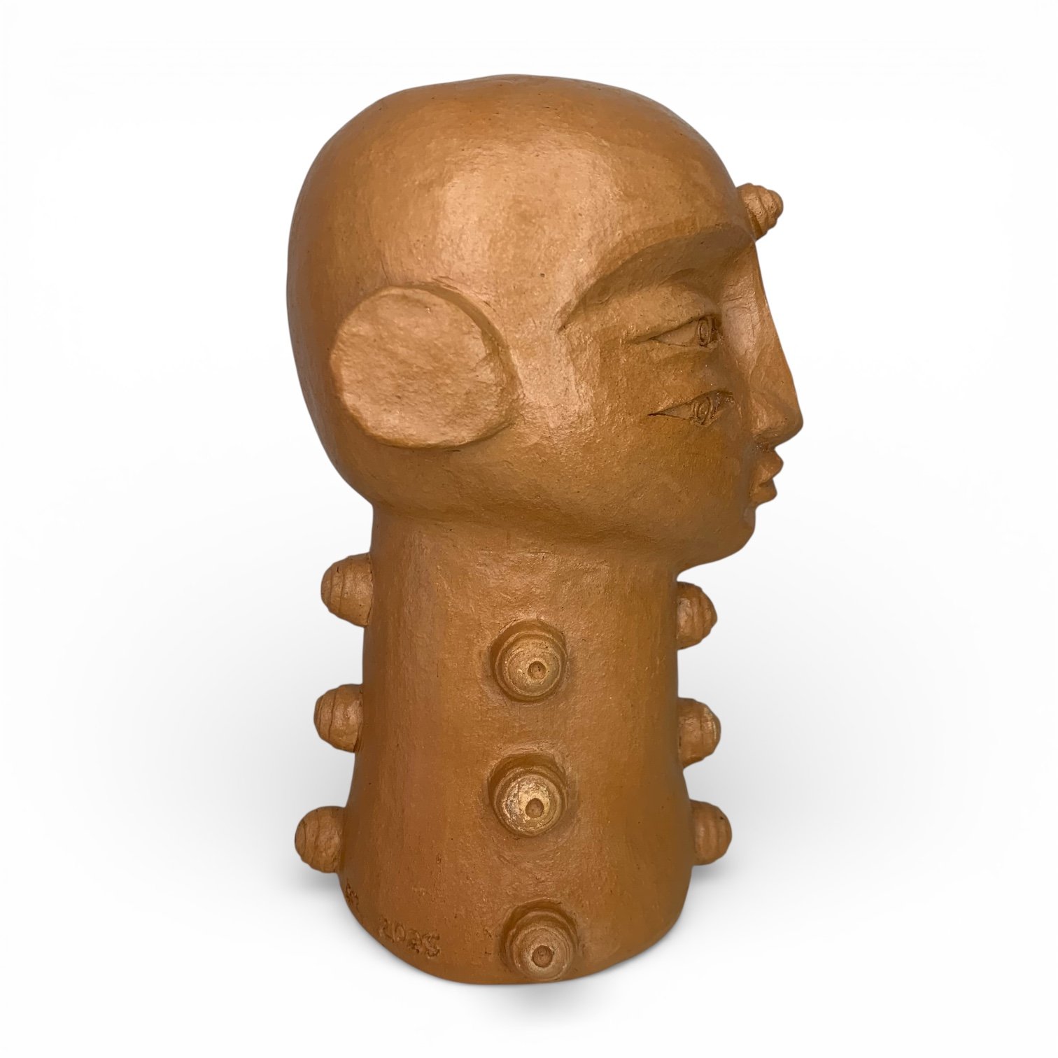 A escultura Olhar da Alma é uma peça em barro que convida à contemplação e ao silêncio. Seu foco está no olhar, elemento central da composição, trabalhado de forma intensa e expressiva, capaz de estabelecer uma conexão direta com quem observa. Não se trata de um rosto comum, mas de uma presença simbólica, que parece atravessar o visível e acessar camadas mais profundas do sentir.