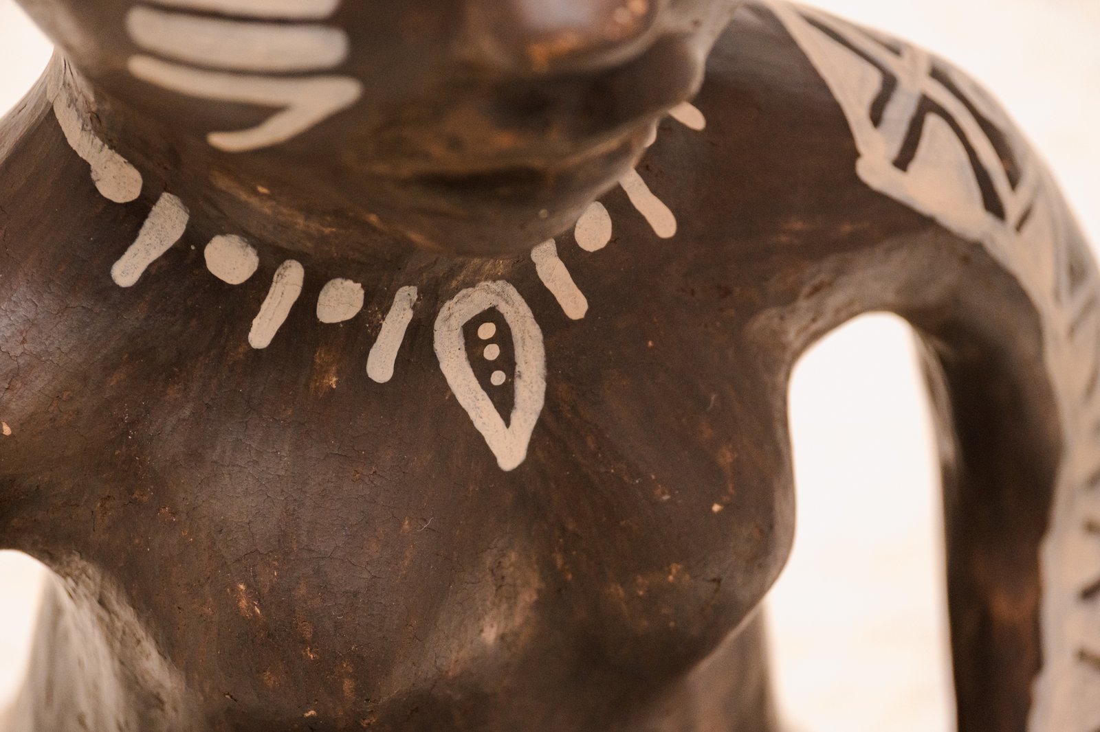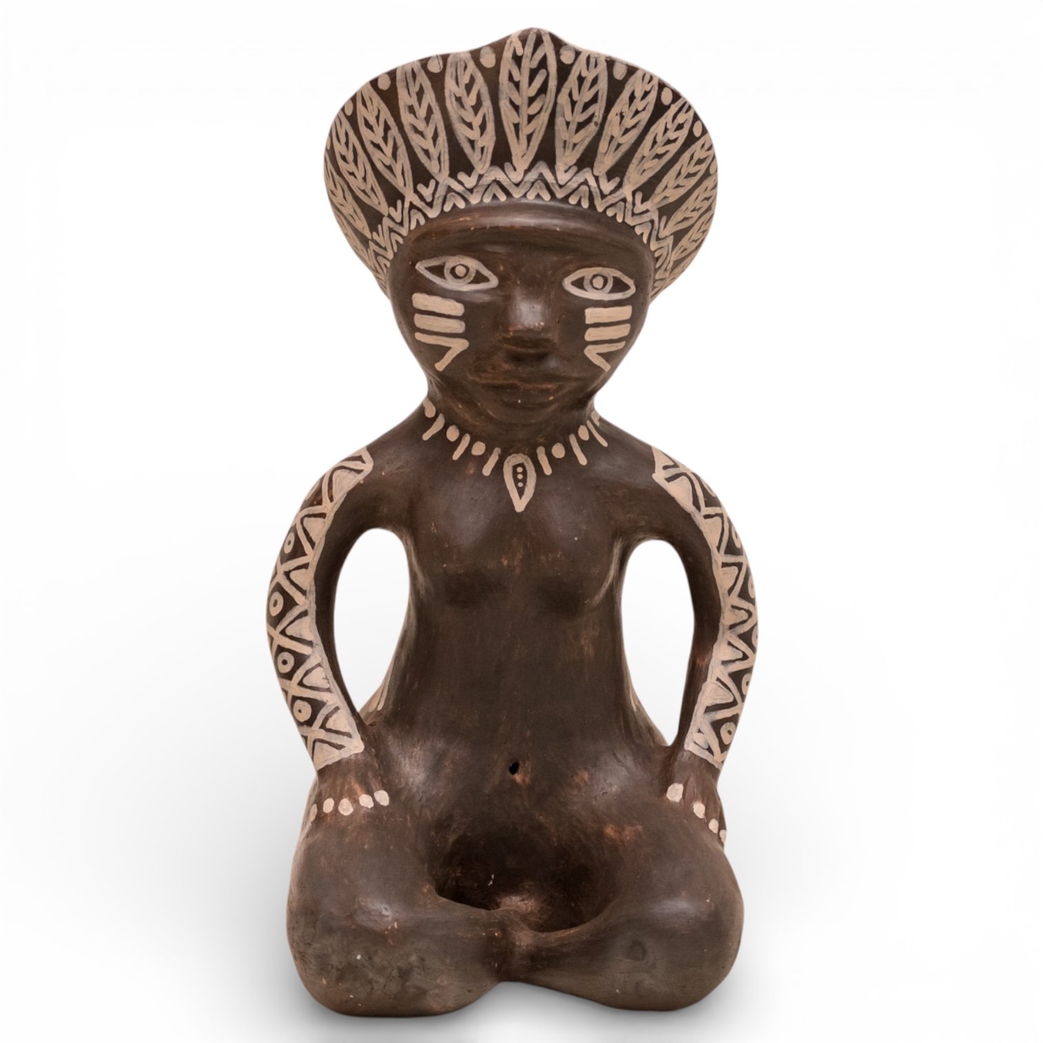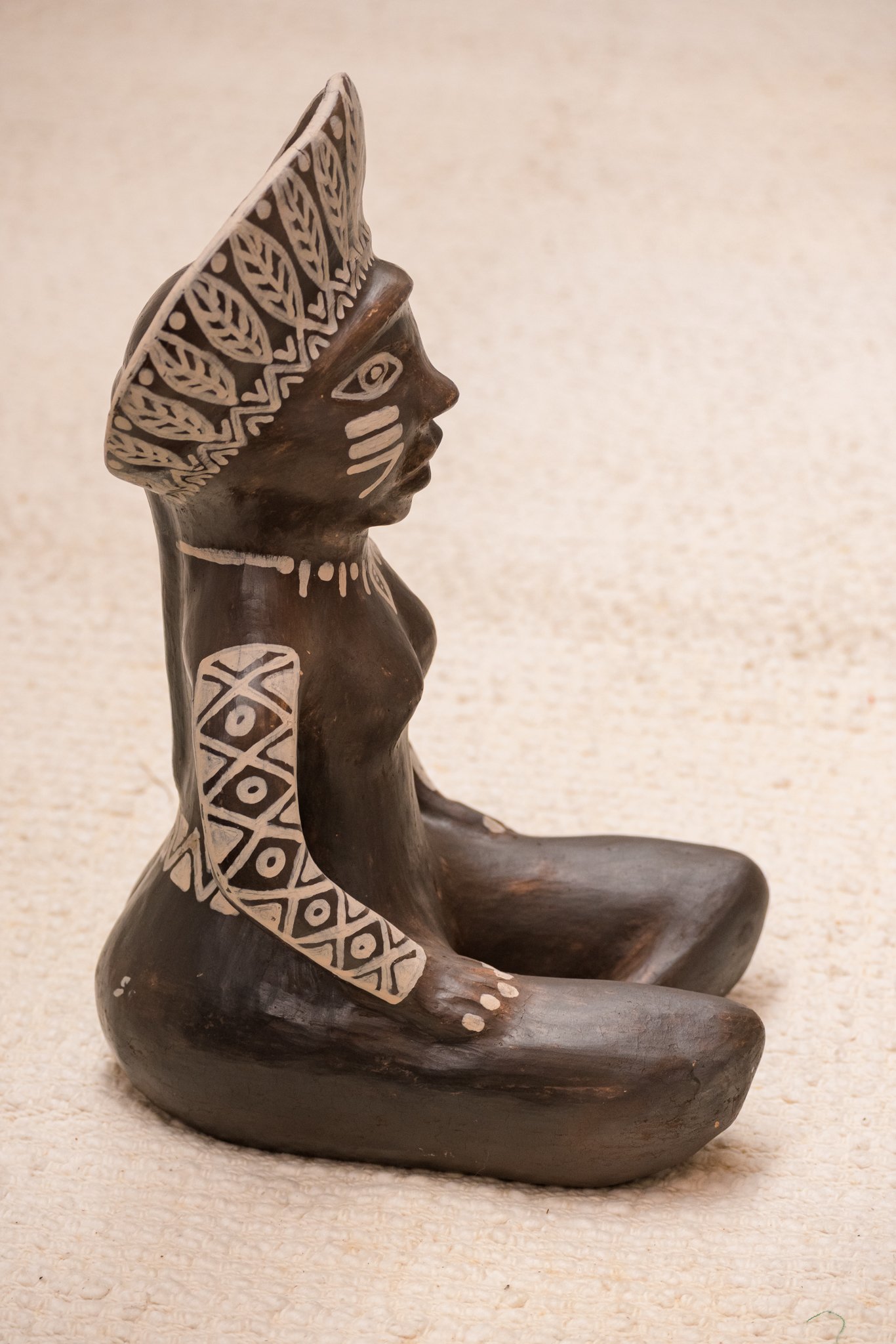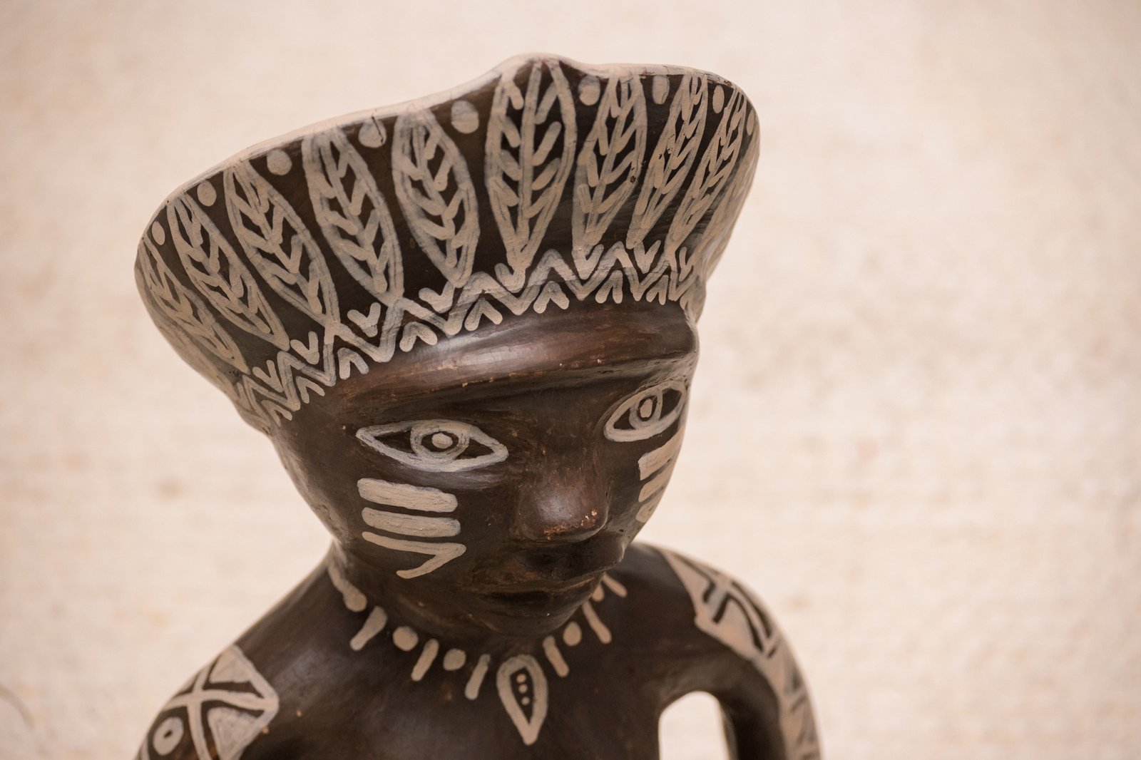 A escultura em cerâmica apresenta uma figura indígena com cocar, modelada e pintada à mão. O artista constrói o volume contínuo, sem excessos, valorizando proporções equilibradas e uma leitura visual limpa. Sobre a argila, aplica grafismos brancos que percorrem o rosto, os braços e o adorno da cabeça, criando contraste com a base cerâmica.