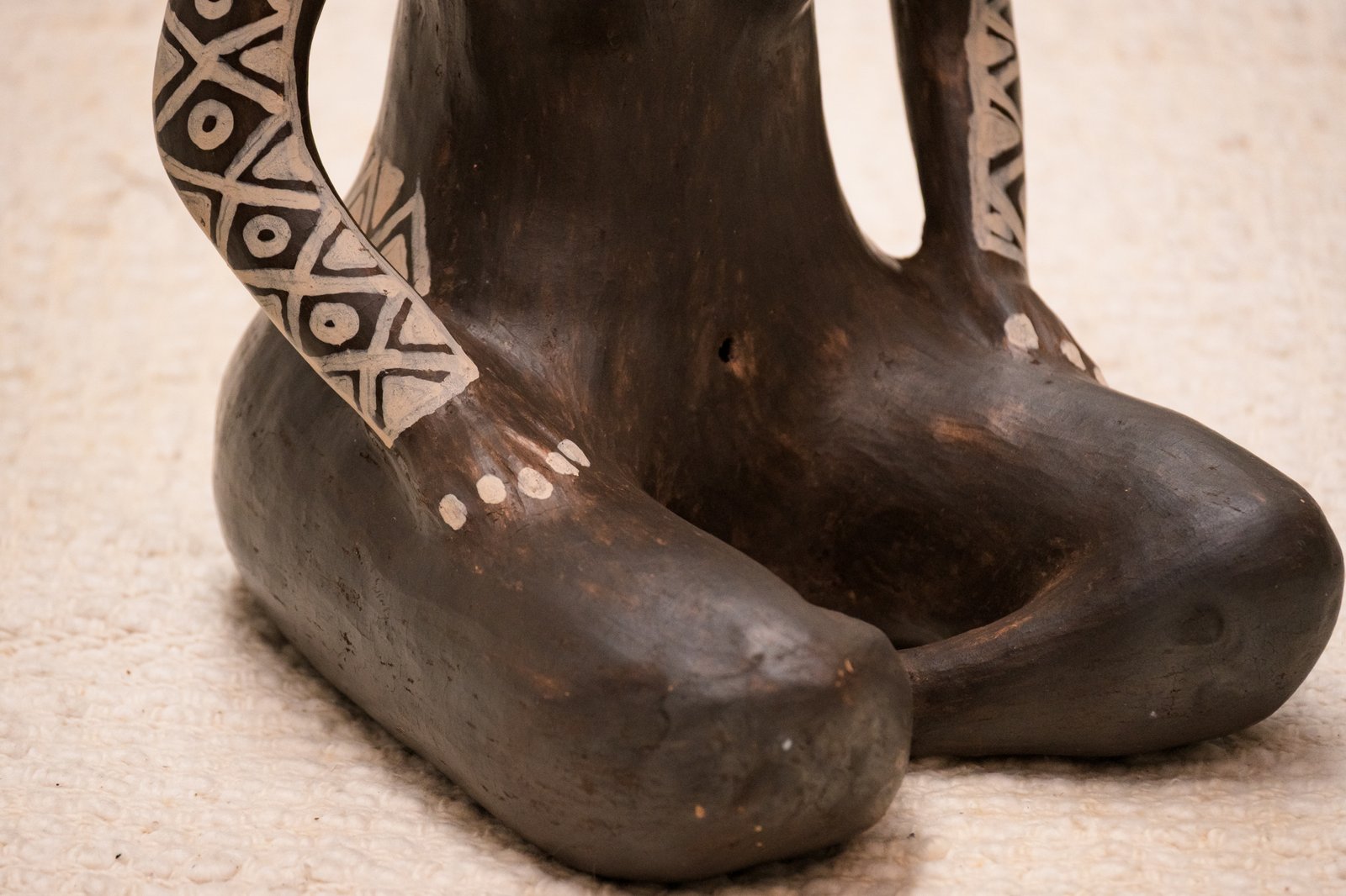 Os grafismos seguem a modelagem da peça e acompanham curvas e relevos com naturalidade, integrando-se à superfície sem rupturas. A pintura participa ativamente da construção da escultura, resultado de um processo manual cuidadoso. Como objeto decorativo, a peça se destaca em estantes, aparadores ou nichos, funcionando como ponto focal no ambiente.