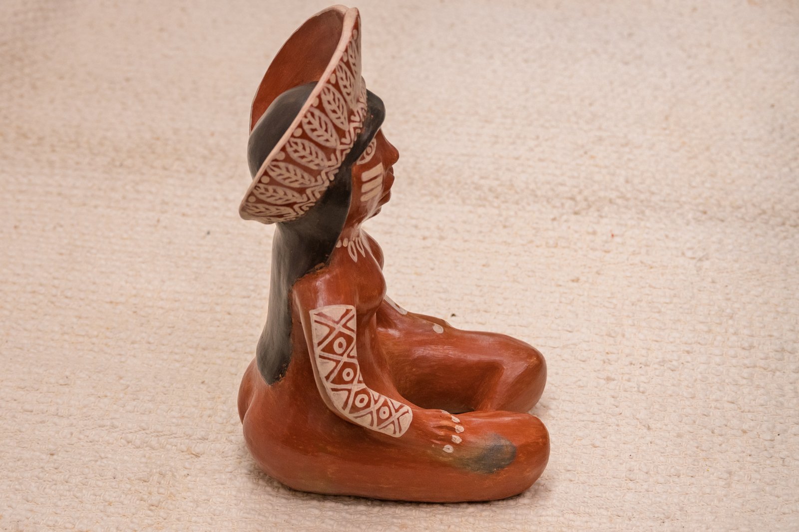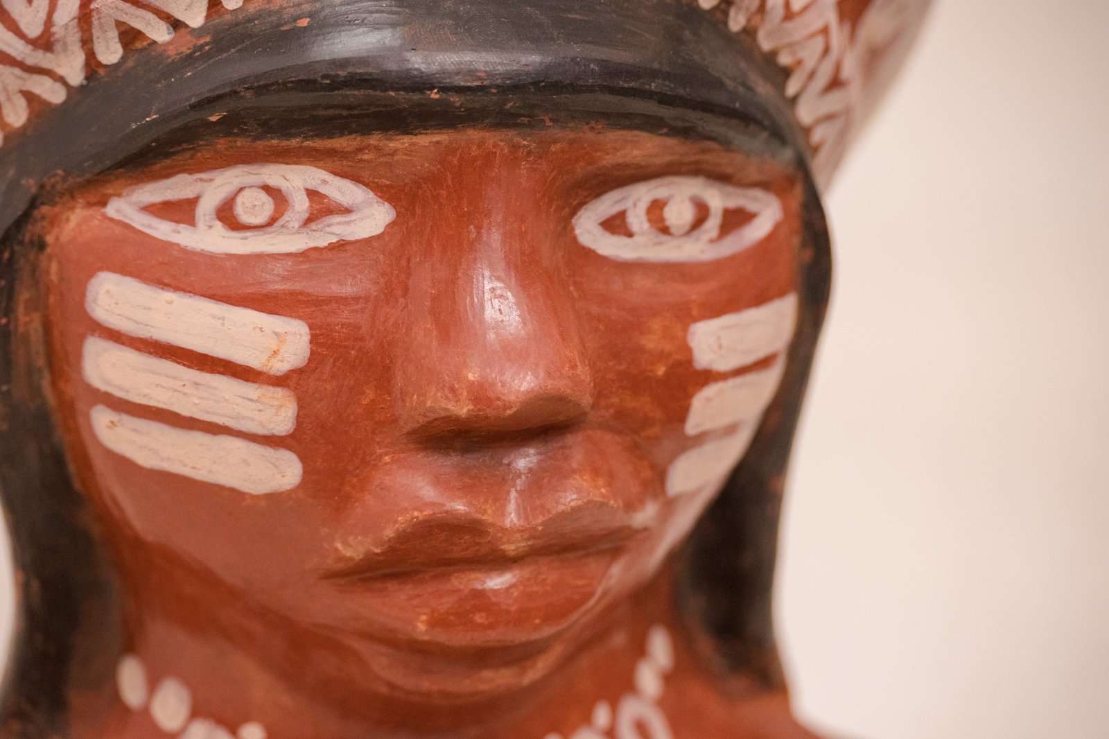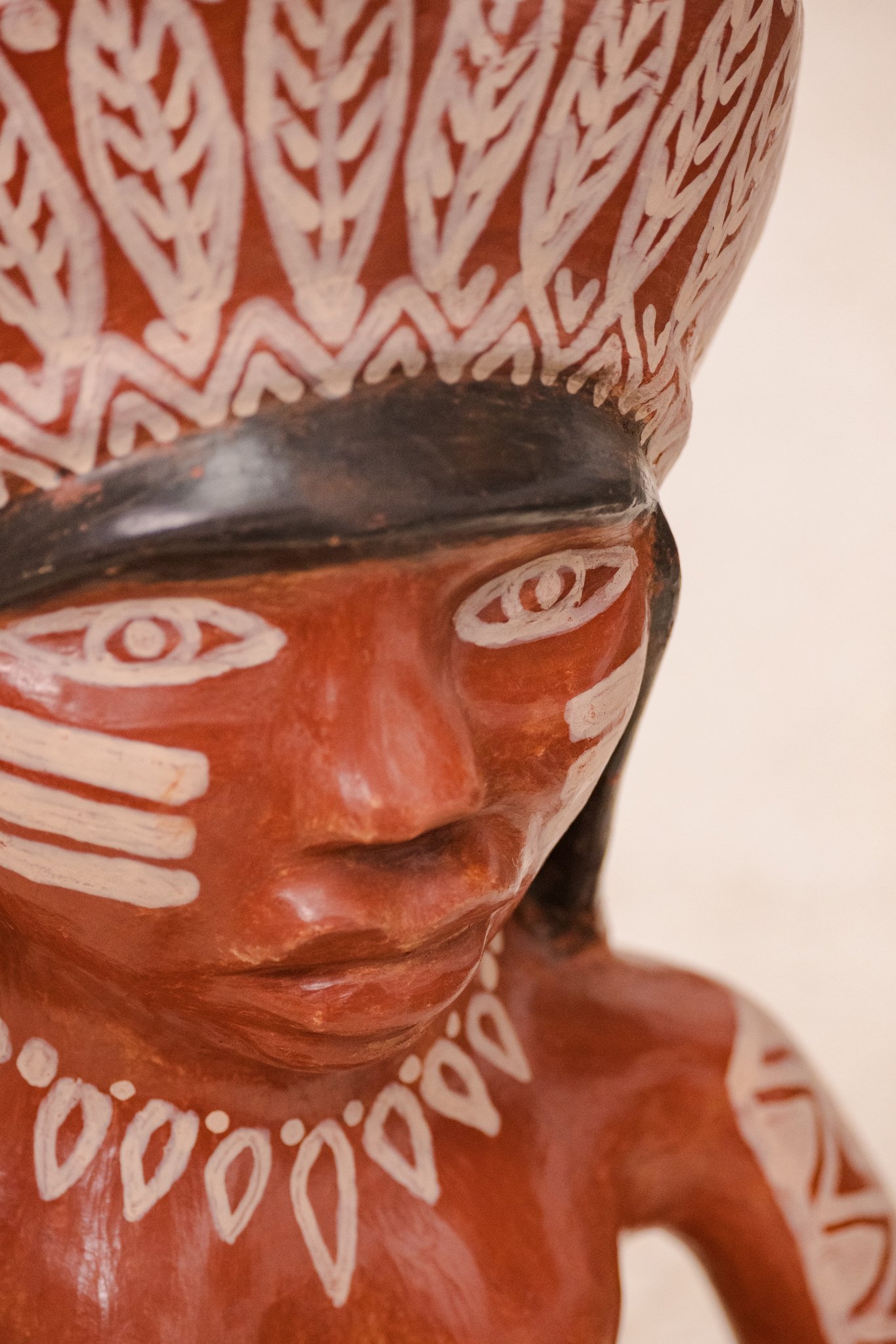 Escultura em cerâmica de figura indígena com cocar, modelada e pintada à mão. O corpo ganha volume contínuo, sem excessos, e sustenta grafismos brancos que percorrem o rosto, os braços e o adorno da cabeça, criando contraste direto com o tom terroso da argila.