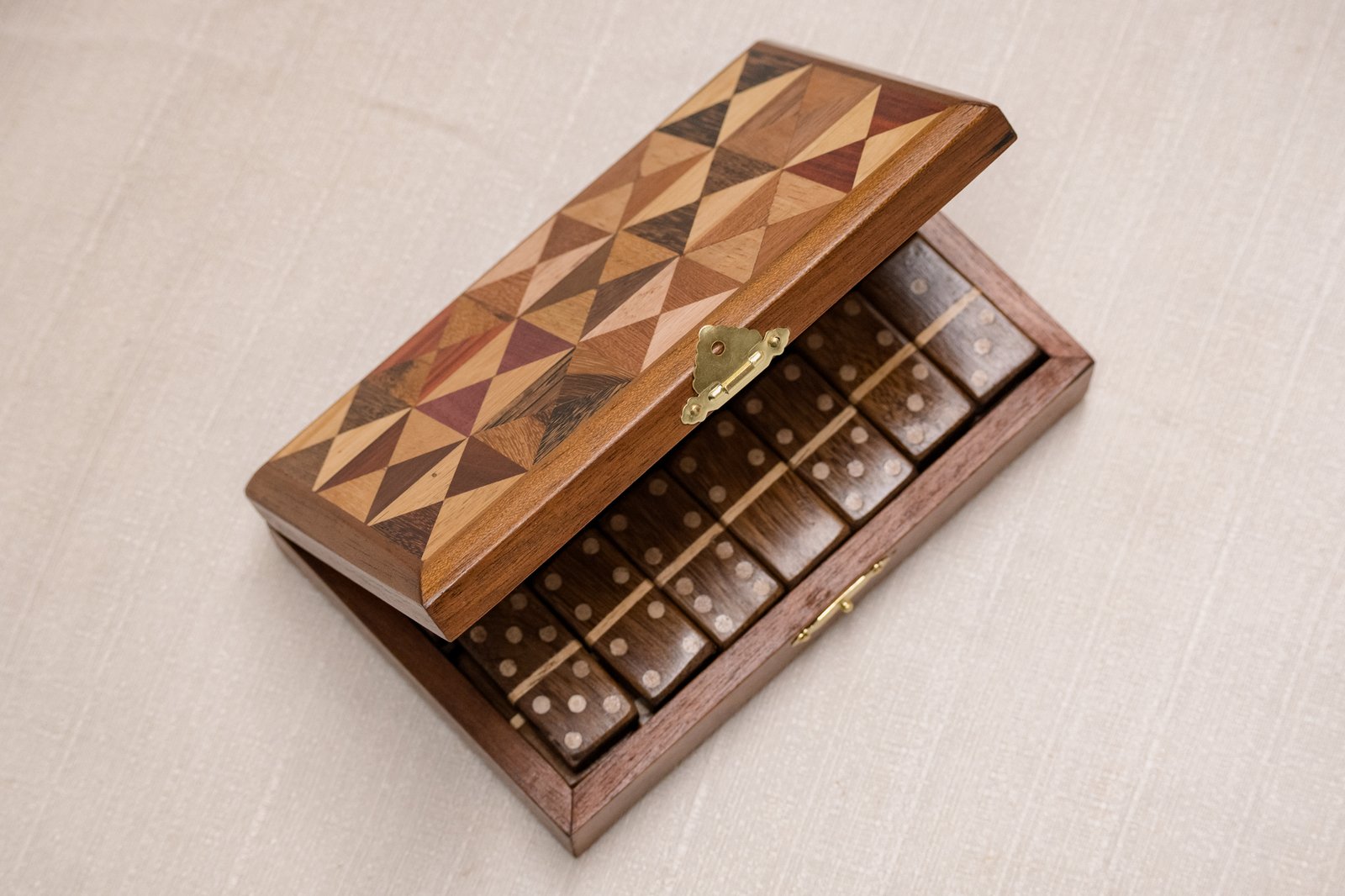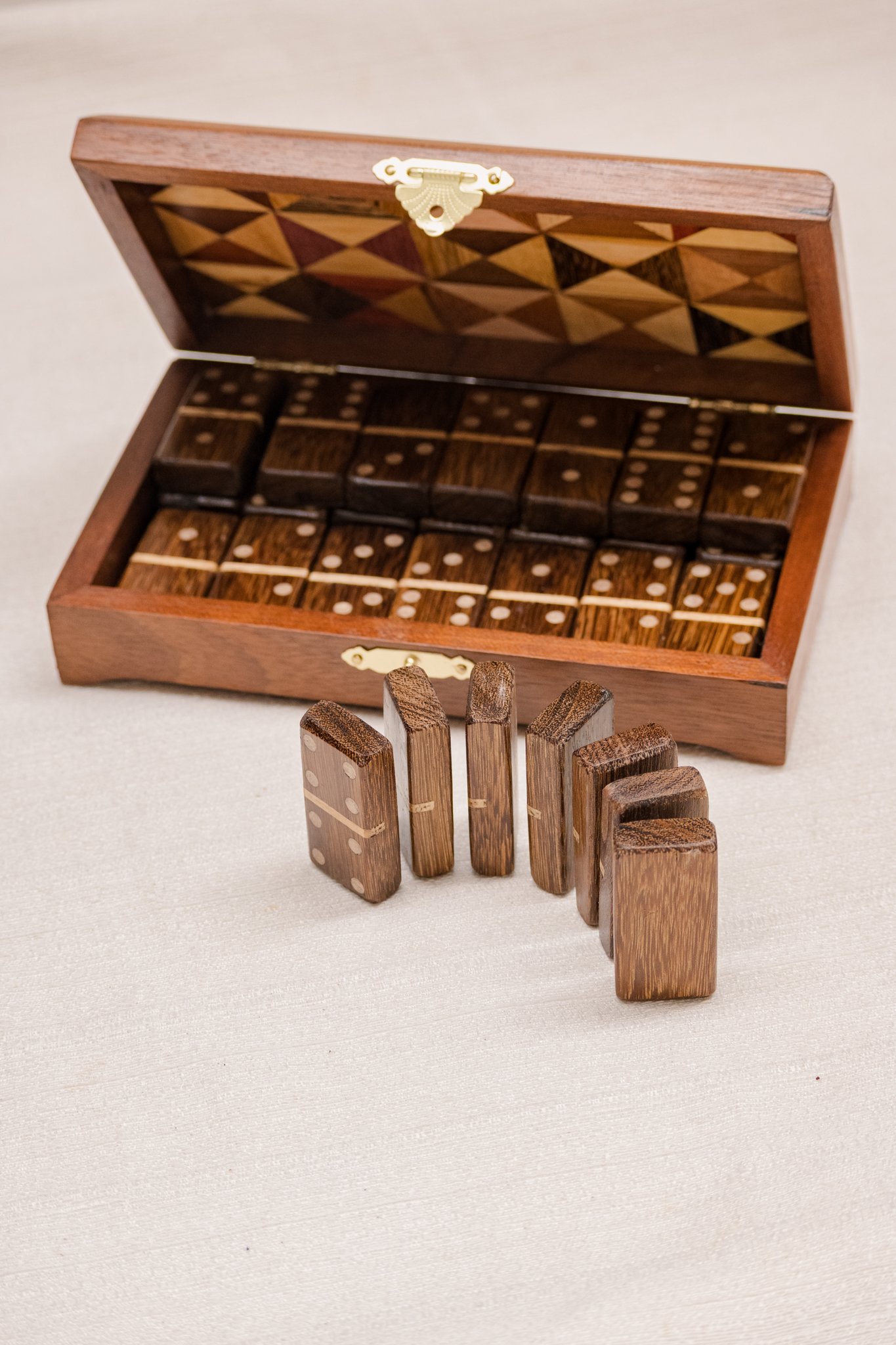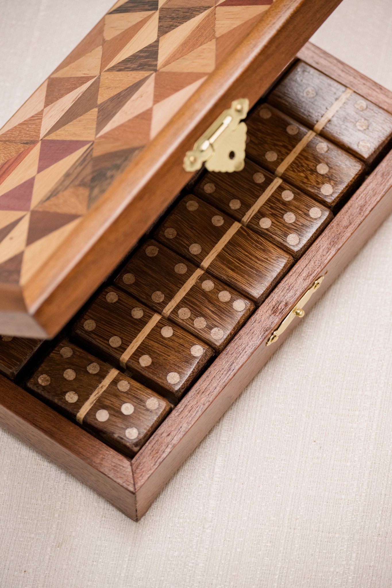 Este jogo de dominó em marchetaria segue esse caminho. A técnica aparece na caixa e em cada peça, formando desenhos construídos pelo encaixe manual de lâminas de madeira. O conjunto acompanha caixa para guardar e transportar o jogo e pode permanecer à vista como objeto decorativo.