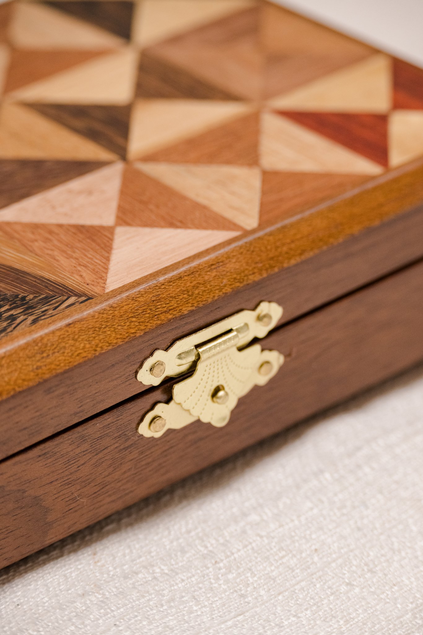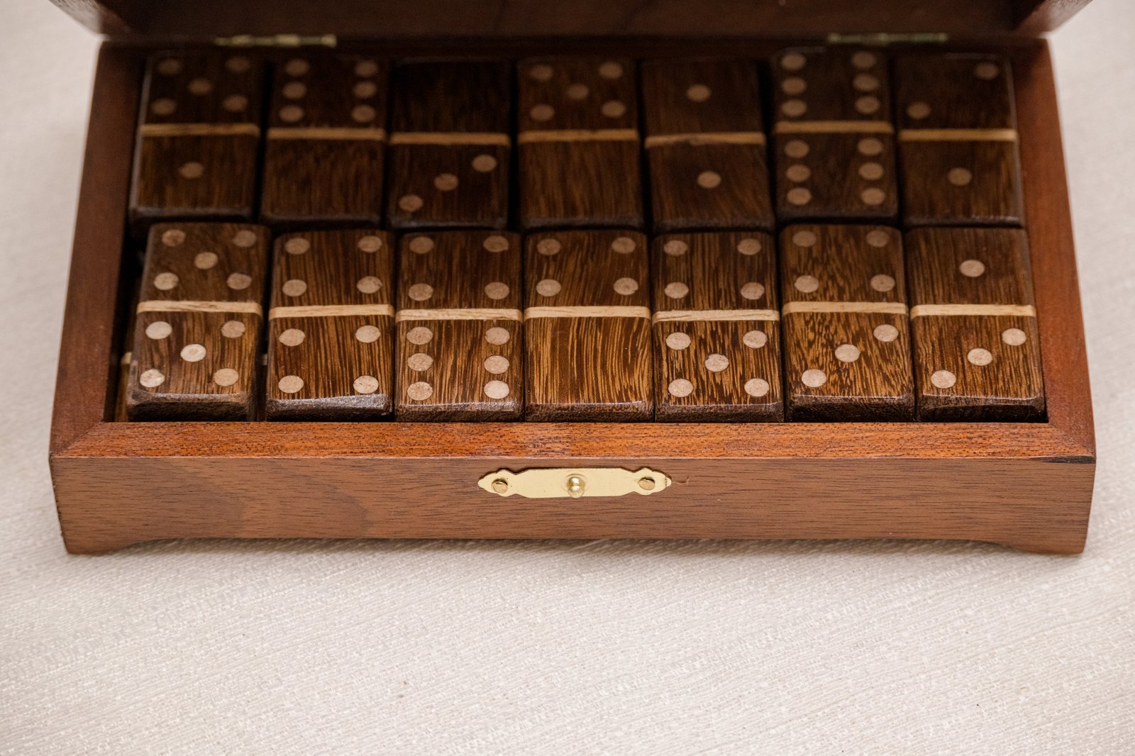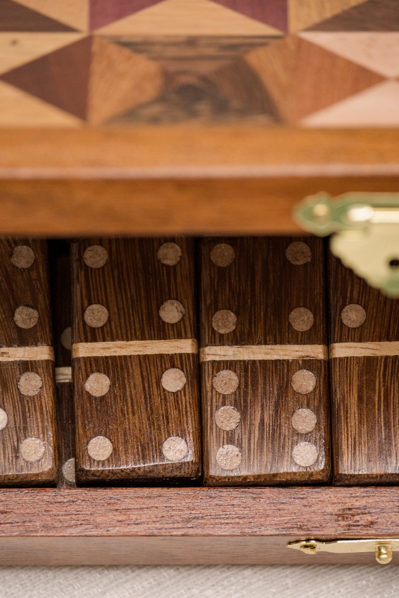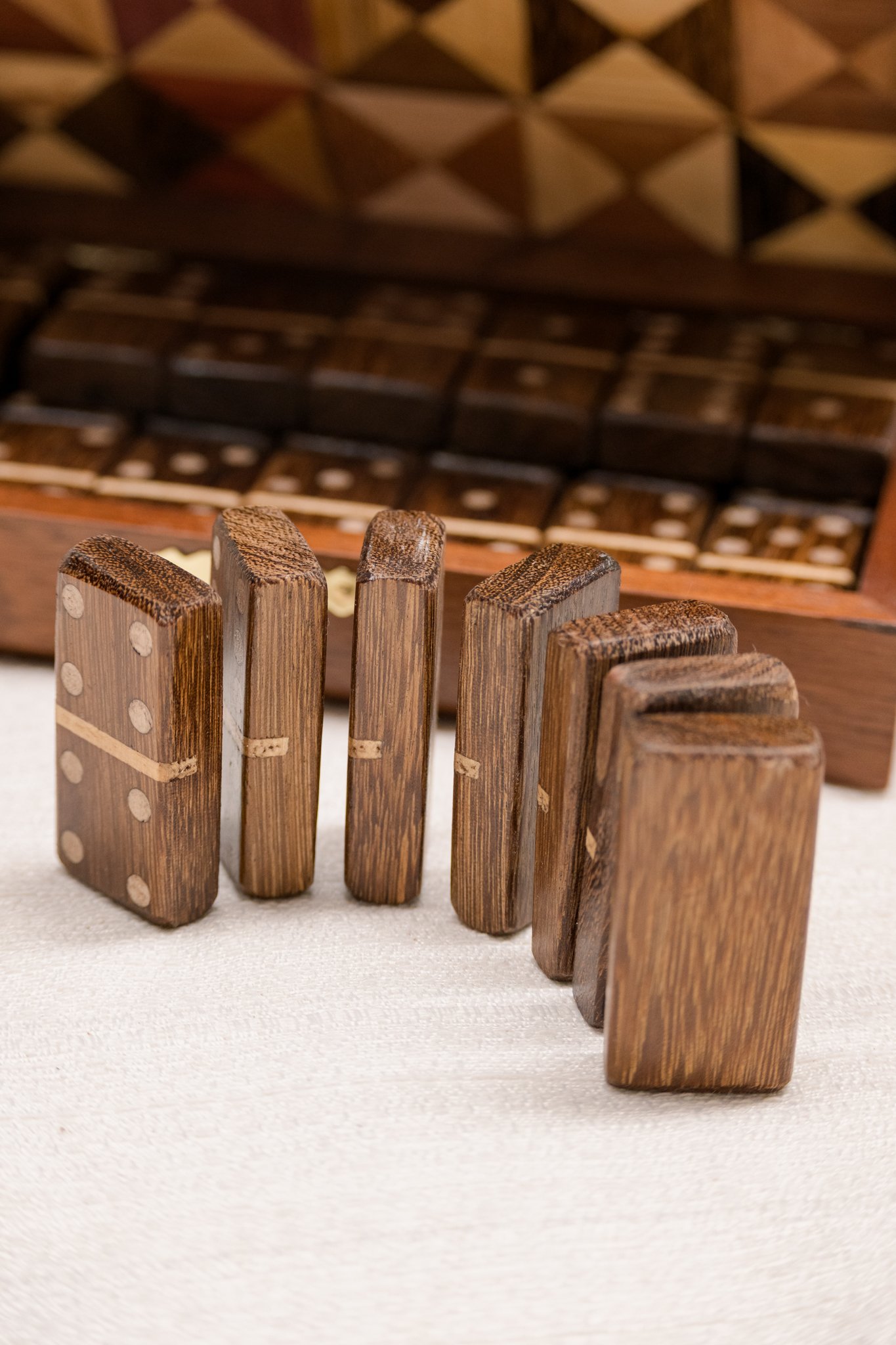 Este jogo de dominó em marchetaria segue esse caminho. A técnica aparece na caixa e em cada peça, formando desenhos construídos pelo encaixe manual de lâminas de madeira. O conjunto acompanha caixa para guardar e transportar o jogo e pode permanecer à vista como objeto decorativo.