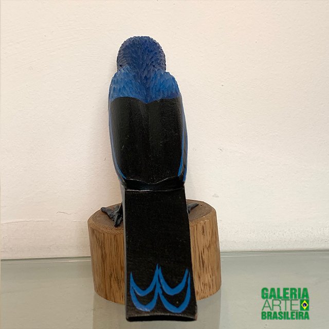 Pássaro Azulão esculpido em destalhes por artesão brasileiro em madeira.