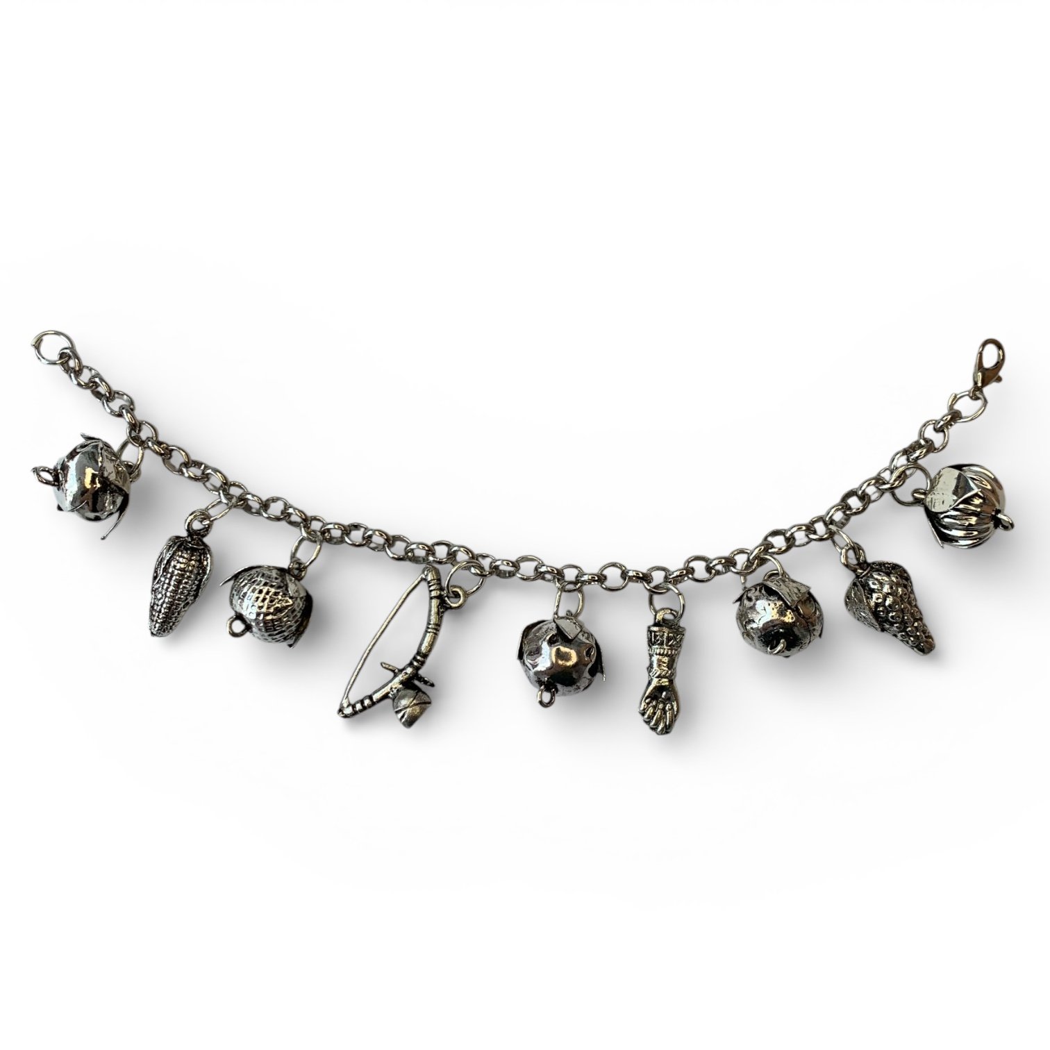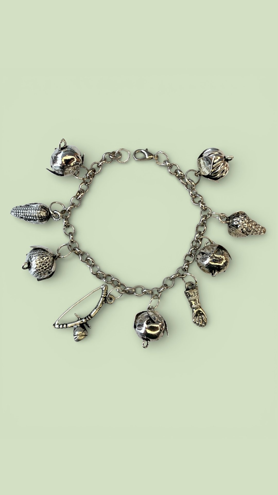 Reúne nove berloques que representam amuletos tradicionais brasileiros, criando um conjunto marcante, cheio de presença e movimento. Os berloques apresentam formas variadas, como frutas, sementes, figa e arco, compondo uma narrativa visual ligada à proteção, fartura e espiritualidade.