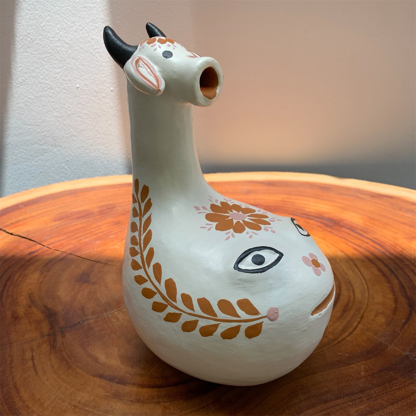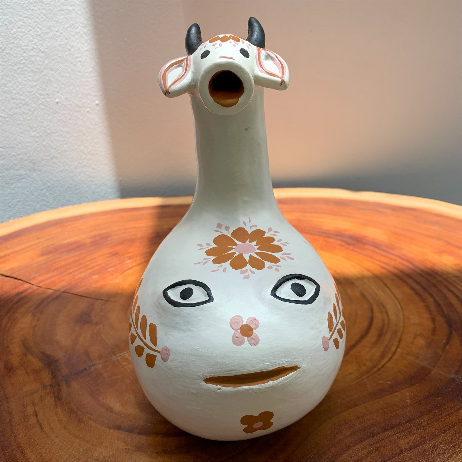 Este sapo-boi em cerâmica é uma peça figurativa de caráter popular, mistura referências de sapo e boi de forma simples e intencional, com boca aberta e chifres pequenos. Os desenhos florais e os grafismos não servem como ornamento solto: eles fazem parte da identidade da peça e reforçam seu aspecto artesanal.