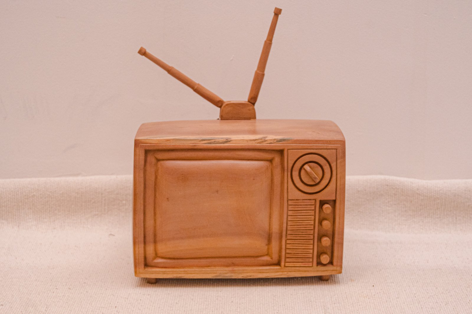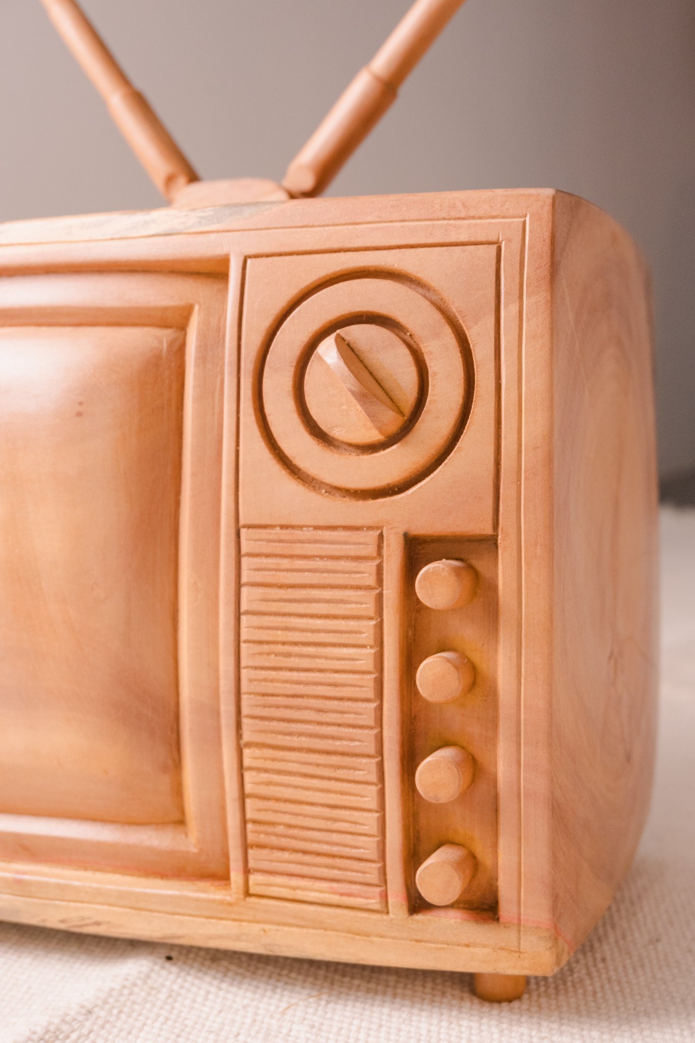 Esta televisão antiga em madeira é uma peça decorativa esculpida à mão. Ela chama atenção pela forma e pela memória afetiva que desperta. Partindo de um bloco de madeira maciça, valorizando o volume, as proporções e os detalhes remetem diretamente aos antigos aparelhos de TV.
